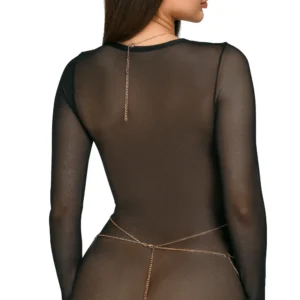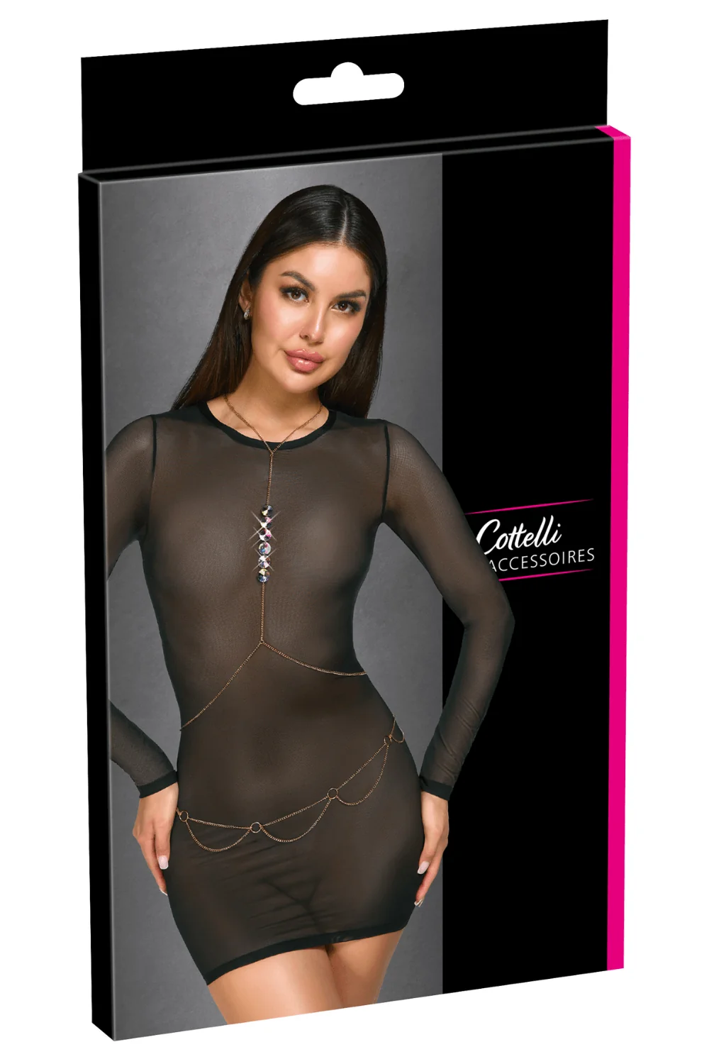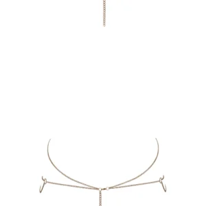 2 goldene Körperketten mit irisierenden holografischen Pailletten. Eine Körperkette mit Hals- und Taillengurt mit irisierenden Strasssteinen im Hologrammeffekt und eine Taillenkette. Auf vielfältige Weise verstellbar – im Nacken und über dem Gesäß mit Karabinerverschluss. Allein oder mit Dessous oder über einem Kleid zu tragen. Material: Metall. Gewicht: 80 Gramm.
