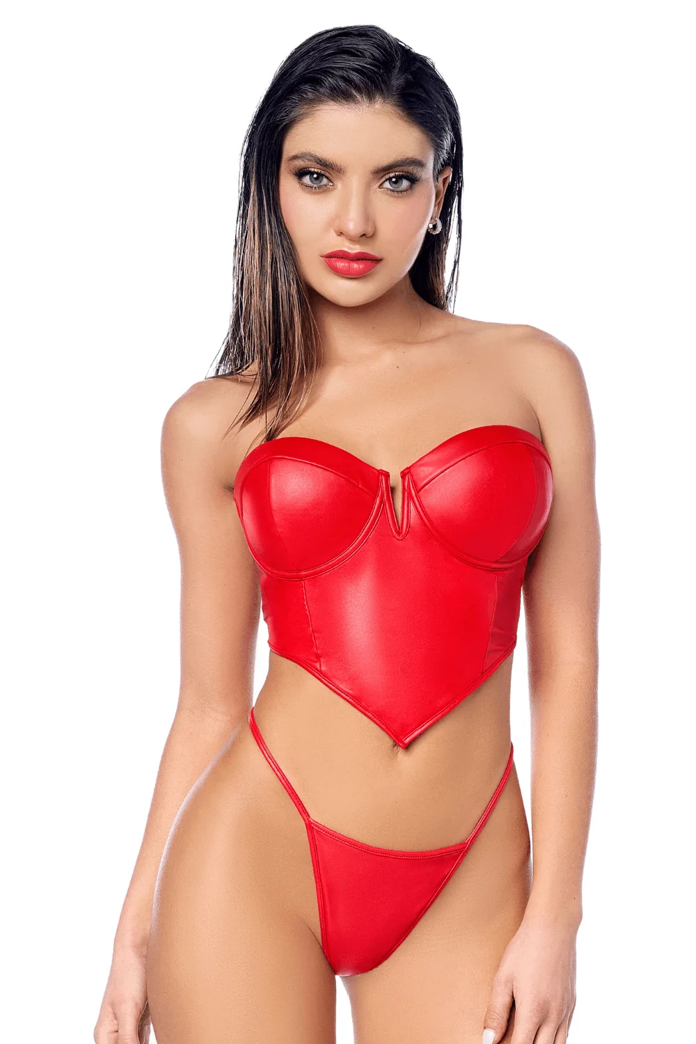 Das strukturierte Bustier mit Bügeln bietet Halt und Betonung, während die abnehmbaren Träger es ermöglichen, den Look nach Belieben zu variieren. Der passende String vervollständigt das Set und schafft ein provokantes und raffiniertes Ensemble.