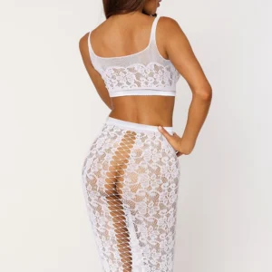 Sexy weiße 2-teilige Dessous-Set. (G-String und Handschuhe nicht enthalten) – BH aus feinem transparentem Netz mit bestickter Spitze, breiten Trägern und elastischem Unterbrustband für perfekten Halt – Weißer, figurbetonter Spitzenrock mit hoher Taille und gekreuzten elastischen Ausschnitten entlang des Rückens. Zusammensetzung: Bralette/Slip Rock: 90% Nylon 10% Spandex / Pflegehinweis: Handwäsche in kaltem Wasser, nicht im Trockner trocknen