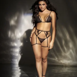 Dreiteiliges Dessous-Set, auf seine maximale Ausdrucksform von Weiblichkeit und Zartheit erhoben. Dieses Dessous-Set umfasst einen Triangel-BH aus transparentem Netz. Verstellbare Träger. Ein Strumpfhalter mit bestickten Blumen-Spitzen und ein passender String. Zusammensetzung: 96% Polyamid 4% Elasthan/87% Nylon 13% Elasthan