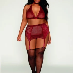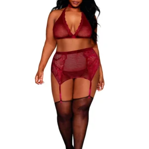 4-teiliges Set in großer Größe BH, Halsband, String und Strumpfhalter rot – DG11776XGAR