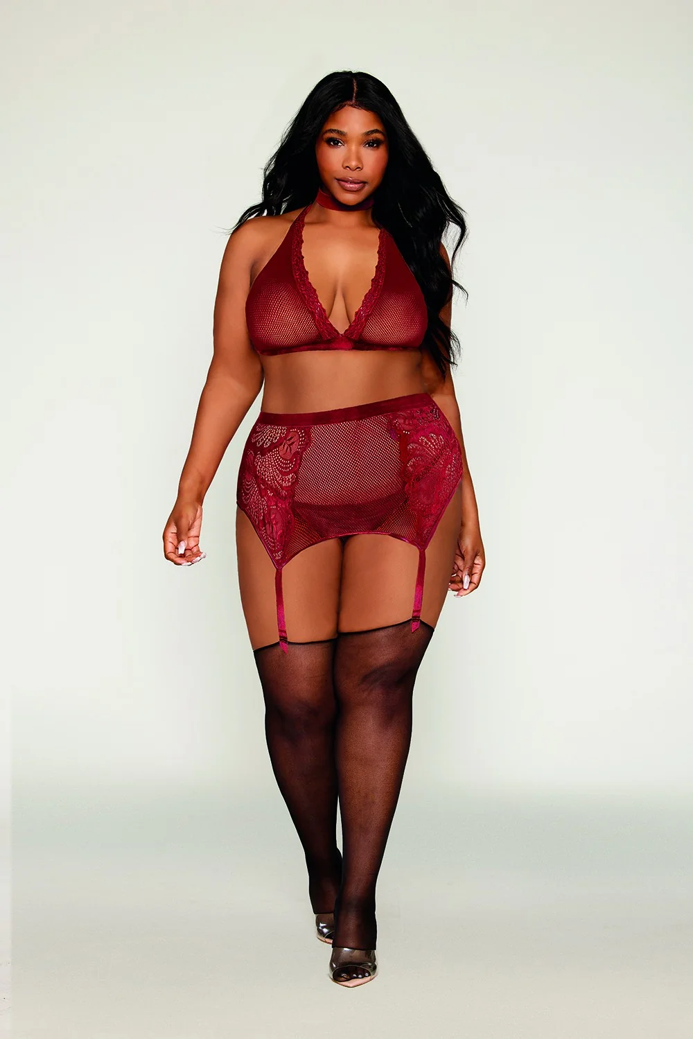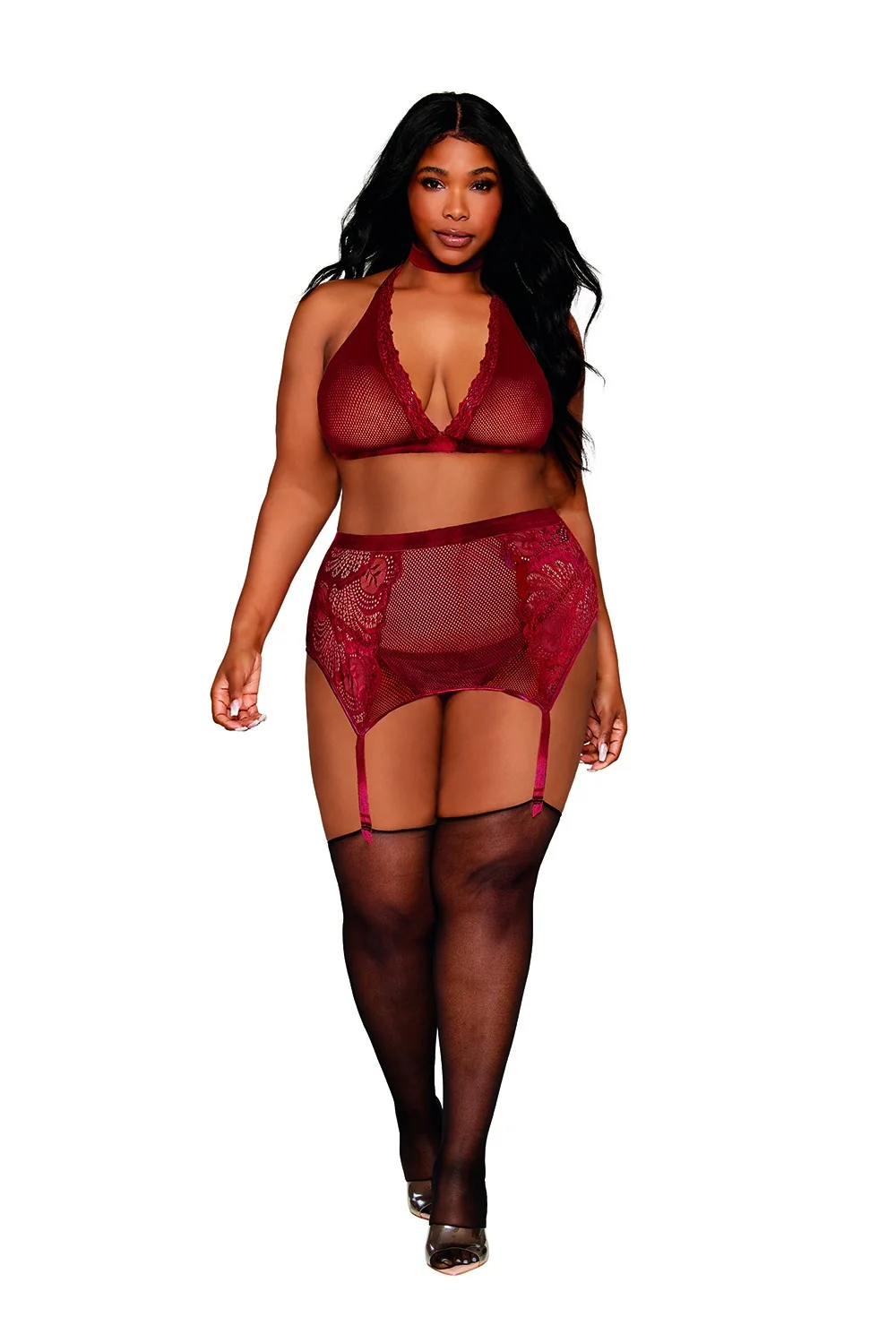 Set aus 4 Teilen in bordeauxrot, große Größe aus Netzstoff und Spitze, bestehend aus Halsband, bügellosem BH, String und Strumpfhalter. Strümpfe nicht inbegriffen. Zusammensetzung: Bralette/Strumpfhalter/String: Netzstoff/Spitze: 90% Nylon, 10% Spandex; Halsband: Samt-Elastik: 100% Nylon. Pflegehinweis: Von Hand in kaltem Wasser waschen, kein Bleichmittel verwenden, nicht im Trockner trocknen.