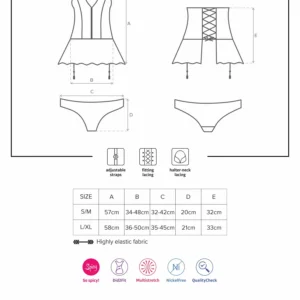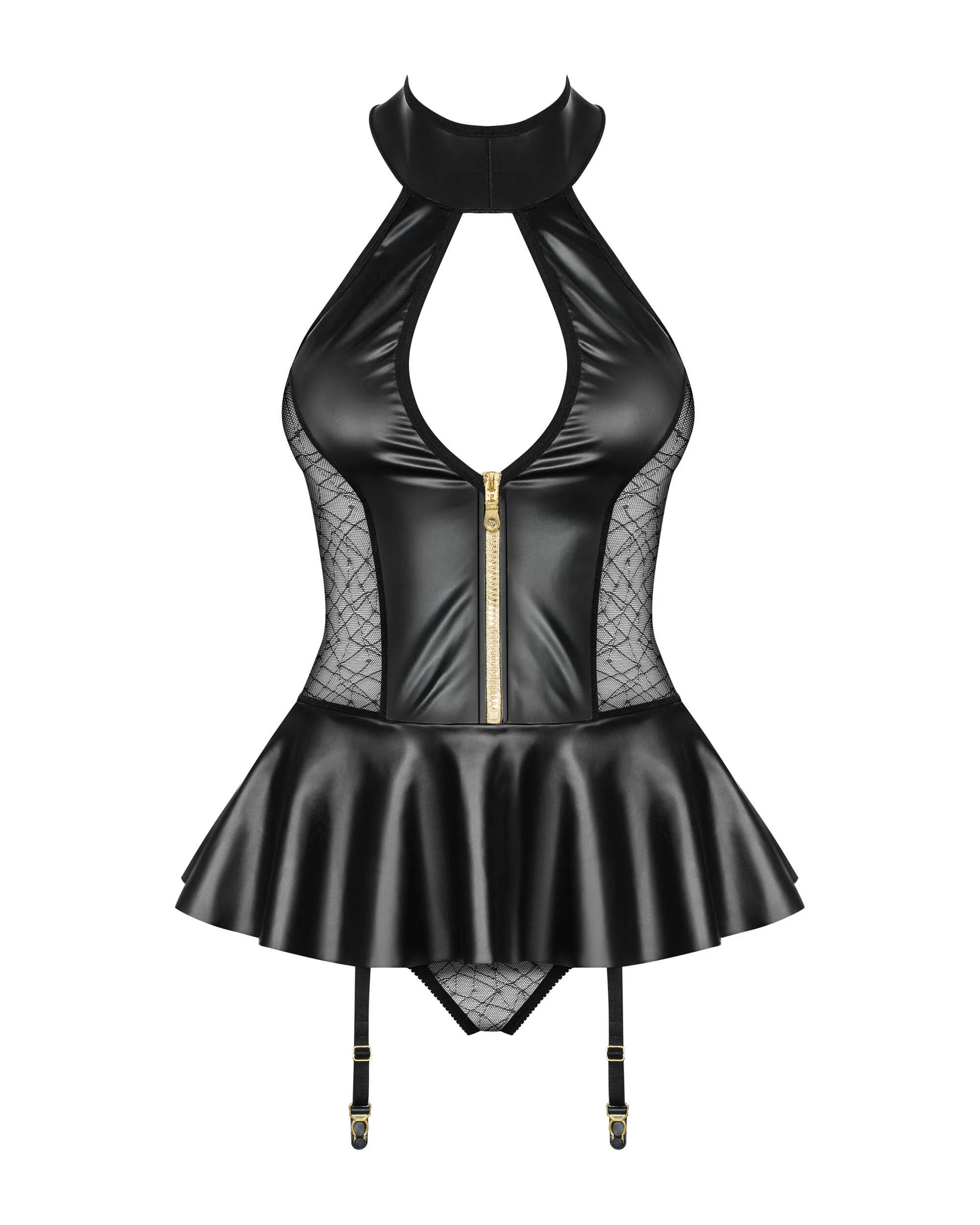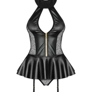 Incarnez la tentation avec cette fabuleuse guêpière 859-COR-1 de la marque Obsessive. Conçue dans une maille fine et transparente avec de subtils motifs, cette guêpière souligne chacune de vos courbes. Sa base à volants et ses découpes en similicuir y ajoutent une touche de sex-appeal. Sa goutte ajourée au décolleté et son laçage au dos en font un atout de charme imparable.Fermeture zippée devant et jarretelles ajustables, culotte incluse.* Les bas ne sont pas inclus. Composition : 90% polyamide, 10% élasthanne