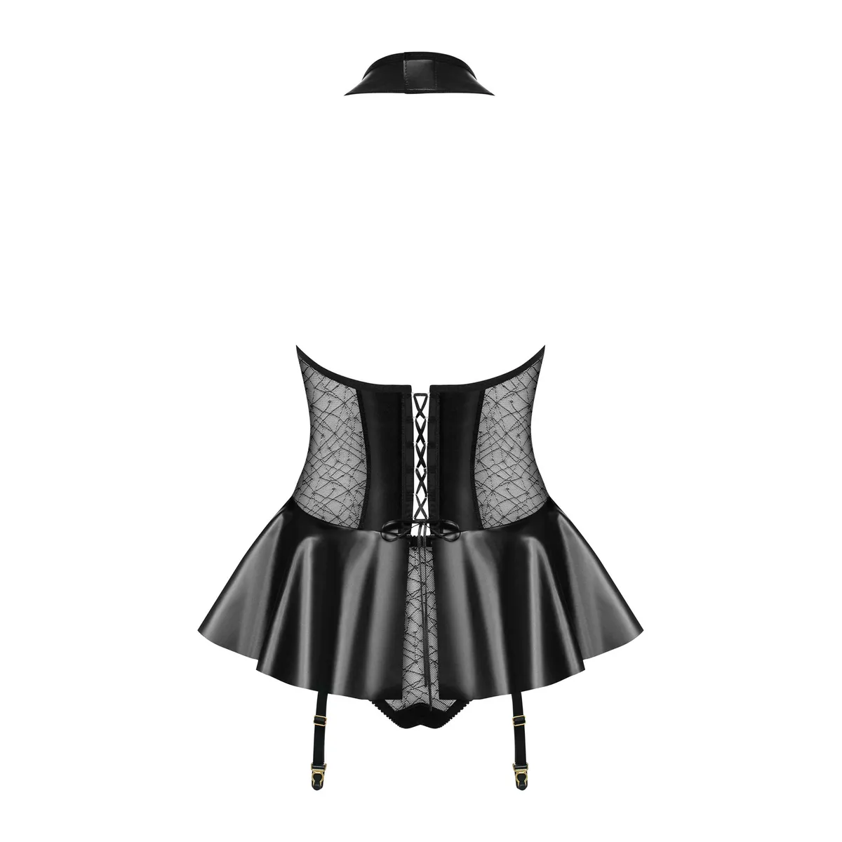 Verkörpere die Versuchung mit diesem fabelhaften Strapshemd 859-COR-1 der Marke Obsessive. Entworfen aus einem feinen und transparenten Netz mit subtilen Mustern, betont dieses Strapshemd jede deiner Kurven. Sein Rüschenbesatz und die Einsätze aus Kunstleder verleihen ihm einen Hauch von Sex-Appeal. Der tropfenförmige Ausschnitt und die Schnürung am Rücken machen es zu einem unwiderstehlichen Charmefaktor. Reißverschluss vorne und verstellbare Strumpfhalter, Slip inklusive. * Die Strümpfe sind nicht enthalten. Zusammensetzung: 90% Polyamid, 10% Elasthan