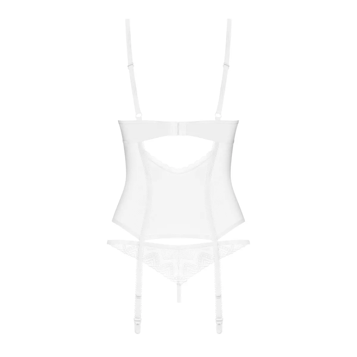 Korsett und String AlissiumEin verführerisches Set, das mit selbstbewussten Frauen im Sinn entworfen wurde. Es kombiniert interessante Details, transparentes Weiß und Spitzeneinsätze. Diese Dessous machen Sie unwiderstehlich und ziehen alle Aufmerksamkeit auf sich! – weißes Korsett und String – Bügel in den Körbchen – Möglichkeit, die nicht abnehmbaren Träger und Strumpfhalter anzupassen – mehrstufiger Verschluss auf der Rückseite – eine Verzierung in Roségold – zarte Spitzenakzente – 94 % Polyamid, 6 % Elasthan – entworfen in der EU – enthält kein Nickel