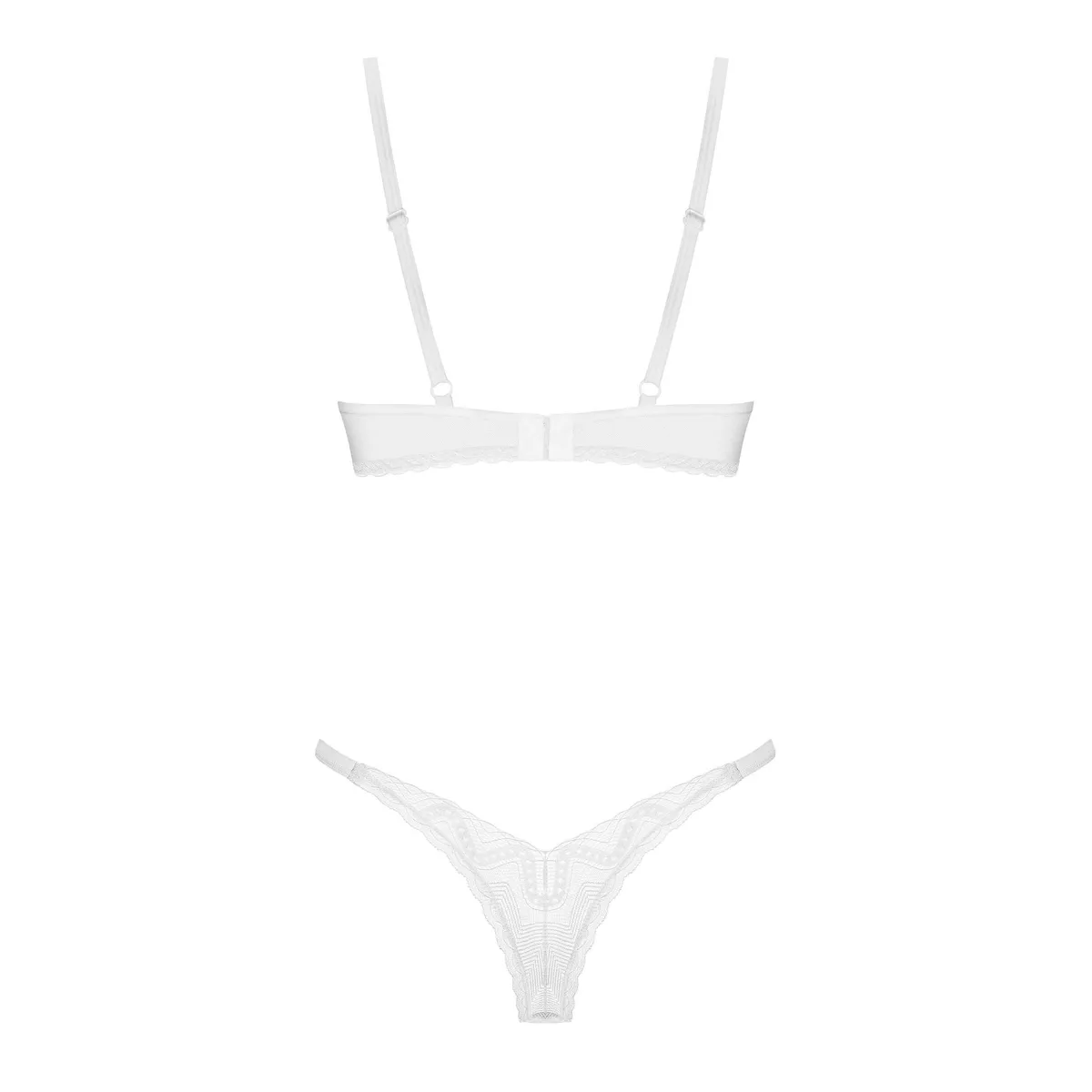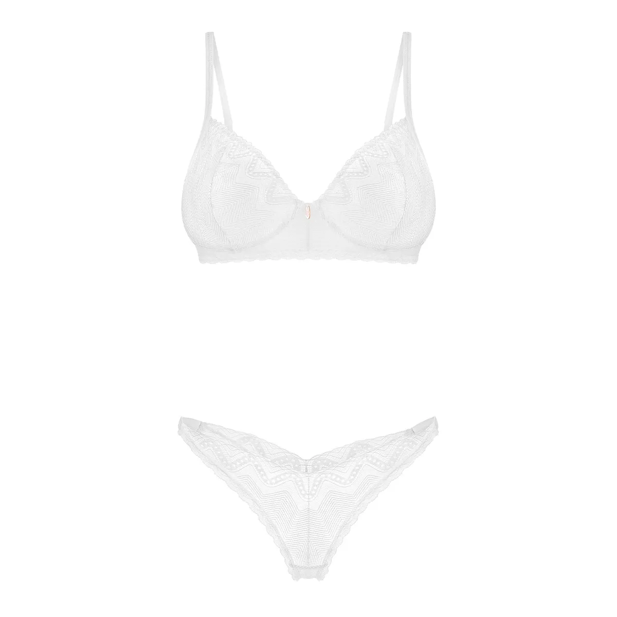 Zweiteiliges Set AlissiumDer weiße String und der BH ziehen mit ihrem universellen Charakter die Aufmerksamkeit auf sich. Diese Unterwäsche ist eine ästhetische Komposition aus Spitze und glattem, transparentem Material. Ein wahrer Klassiker in einer sehr verführerischen Version. – ein Set bestehend aus einem weißen String und einem BH – weiche Körbchen mit Bügel – verstellbare Träger und mehrstufiger Verschluss – Spitze mit geometrischem Muster – Anhänger in Roségold – 90% Polyamid, 10% Elasthan – entworfen in der EU – enthält kein Nickel