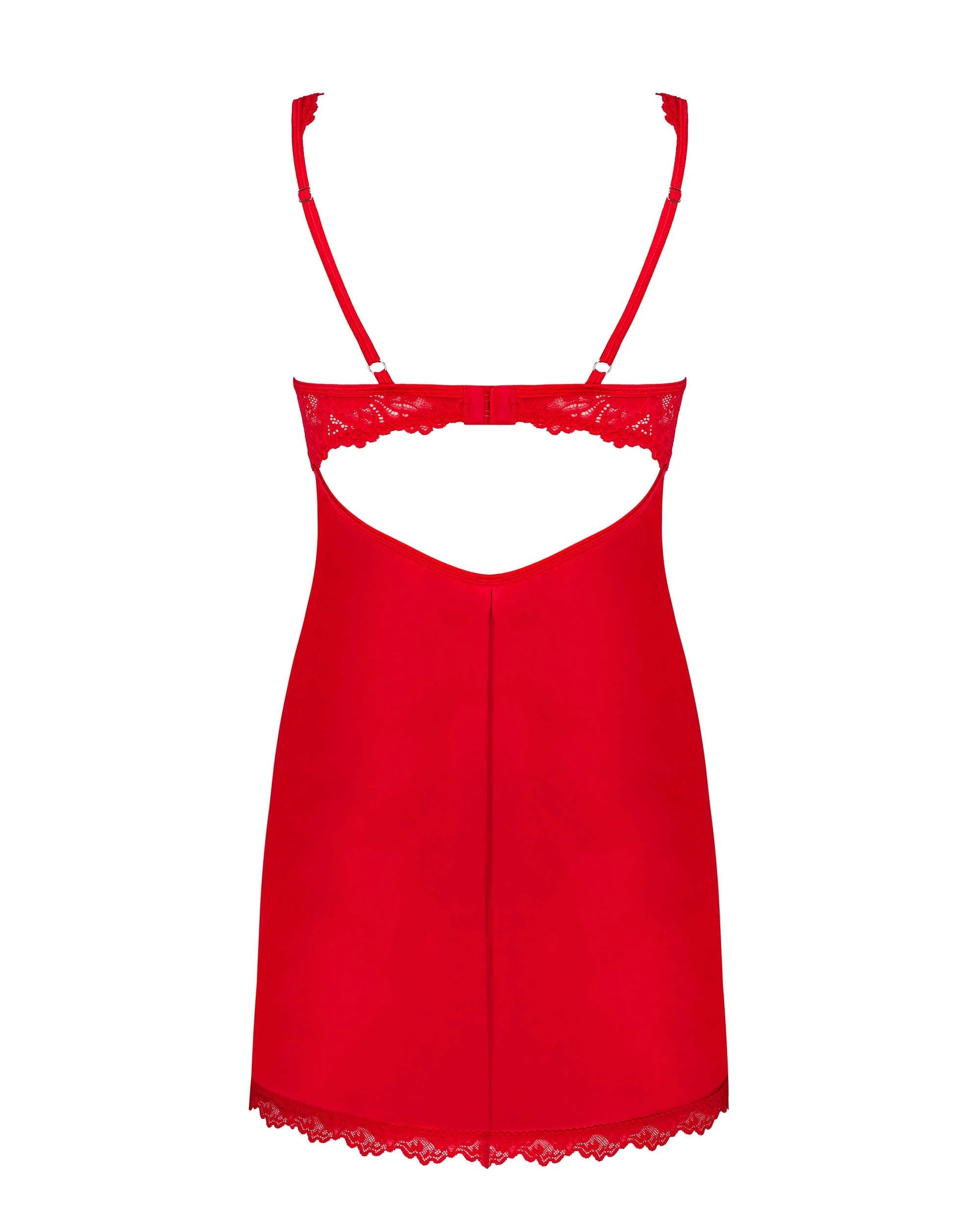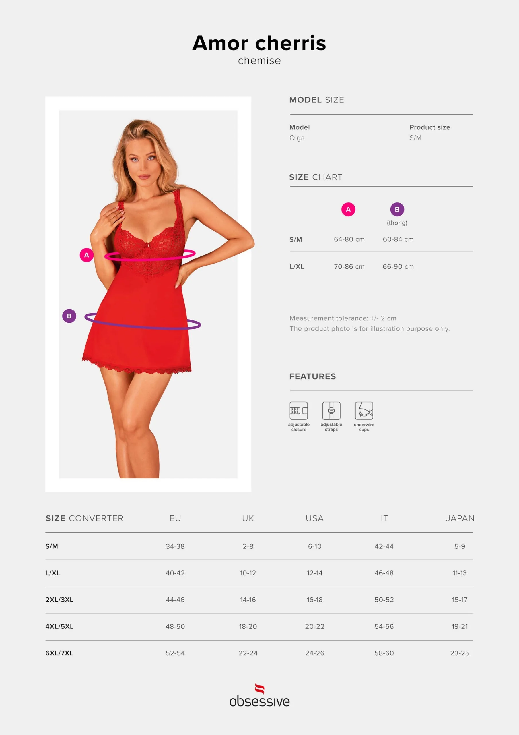 Nuisette Amor Cherris Cette nuisette chaude, féminine et extrêmement séduisante de la collection Amor Cherris vous fera craquer au premier regard ! La délicatesse de la dentelle et l’élégance classique envelopperont votre corps de plaisir, et le rouge juteux augmentera la température de la soirée. Oserez-vous l’essayer? Découvrez plus de détails :- nuisette rouge sang Amor Cherris en ensemble avec string- dentelle féminine – ajoute de l’élégance- coupe sensuelle – souligne la forme de la silhouette- bretelles réglables décorées – un ajustement parfait- soutien-gorge à armatures – bel aspect de la poitrine- fermeture réglable à l’arrière – confort et commodité- décoration de bijoux sur le buste – un ajout charmant- matière agréable et délicate (95% polyester, 5% élasthanne)