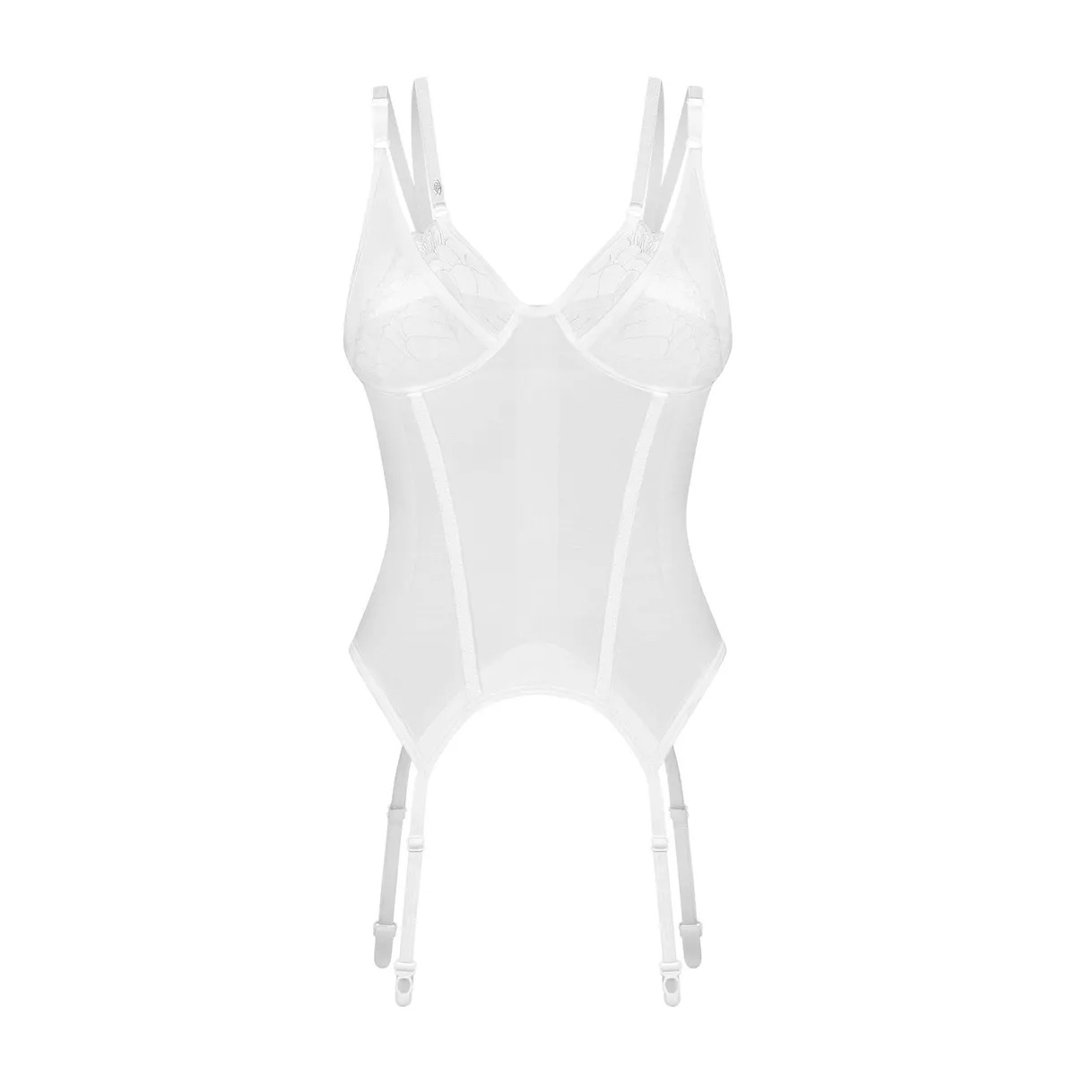 Weißes Arrowel-KorsettEin weißes Korsett aus transparentem Stoff. Es verfügt über doppelte Körbchen mit zarten Spitzenakzenten. Die vertikale Verstärkung formt die Taille, während die Bügelkörbchen die Form betonen. Der verstellbare Verschluss und die Träger sorgen für eine perfekte Passform. Oberschenkelgurte vervollständigen den sexy Look. Weißes Korsett aus transparentem StoffDoppelte Körbchen mit verführerischer SpitzeVertikale Verstärkung und BügelkörbchenVerstellbarer Verschluss und TrägerMinimalistisches Detail in SilberNickelfreiEntworfen in der EUDieses Produkt ist nicht für Kinder unter 3 Jahren geeignet – Erstickungsgefahr durch kleine Teile, die sich vom Produkt lösen können.