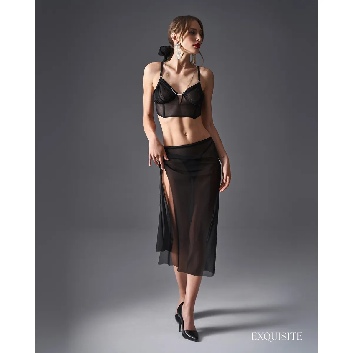 Aurorium Top SchwarzDas schwarze Aurorium-Oberteil formt Ihre Silhouette mit vertikalen Stäbchen und einem tiefen V-Ausschnitt. Die verstellbaren Träger und ein mehrstufiger Verschluss am Rücken bieten eine anpassbare Unterstützung, während das transparente Netzgewebe eine atmungsaktive und sinnliche Note verleiht.- vertikale Stäbchen und Unterbrust für eine strukturierte Formgebung – transparentes Netzgewebe für provokante Transparenz – verstellbare Träger und mehrstufiger Rückenverschluss – dekorative Anhängerdetails – hypoallergen (nickelfrei) – erhältlich in zwei Farben: Schwarz und Weiß – entworfen in der EU – 94% Polyamid, 6% ElasthanDieses Produkt ist nicht für Kinder unter 3 Jahren geeignet – Erstickungsgefahr aufgrund kleiner Teile, die sich vom Produkt lösen können.