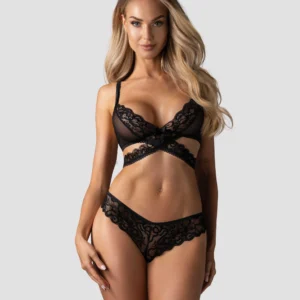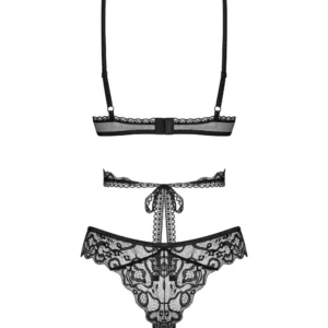Ensemble 2 pièces Blomentis Sublimez vos moments intimes avec cet ensemble de lingerie exquis. Le soutien-gorge et la culotte en dentelle mélangent des motifs délicats avec un tissu lisse et transparent. Le design minimaliste met en valeur votre charme subtil avec une touche de sophistication, ce qui le rend parfait pour les soirées romantiques.- soutien-gorge et culotte noirs- cravate en dentelle à la taille- fermeture à plusieurs étages avec sangles réglables- pendentif en argent avec chevalière Obsessive- 90% polyamide, 10% élasthanne – conçus dans l?UE- sans nicke