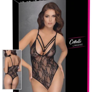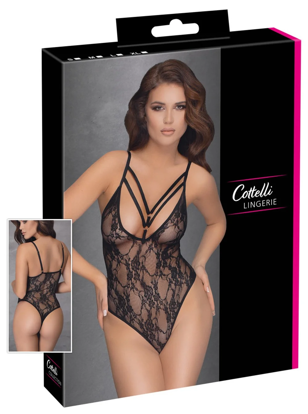 Stil und Sinnlichkeit mit diesem Body-String aus schwarzer Blumenspitze. Wunderschöner, sehr verführerischer tiefer Ausschnitt, bei dem sich dehnbare Bänder mit zwei goldenen Ringen verbinden. Die Träger sind verstellbar für eine perfekte Passform. Body-String aus feiner schwarzer Spitze aus der Cottelli-Kollektion. Zusammensetzung: 90% Polyester, 10% Spandex.