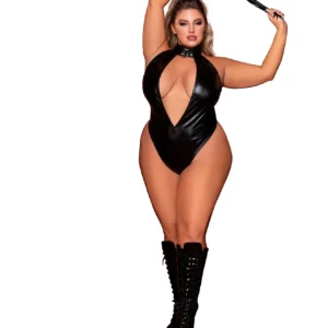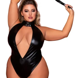Body, große Größe aus der Dreamgirl-Kollektion, aus dehnbarem Kunstleder mit Nietenkragen und Peitsche. Dieses Body-Set aus Kunstleder umfasst: – Halsband mit silbernen Nieten und Ringdetails – Klettverschluss auf der Rückseite des Halses – Tiefer Ausschnitt – Abnehmbares Peitschenaccessoire, das am Ring des Halsbands befestigt werden kann – Rückenfrei, String-Effekt auf der Rückseite des Bodys. Zusammensetzung: Body: Kunstleder: 95% Polyester, 5% Spandex; Peitsche: Ring: 100% Metall; Kunstleder: 95% Polyester, 5% Spandex