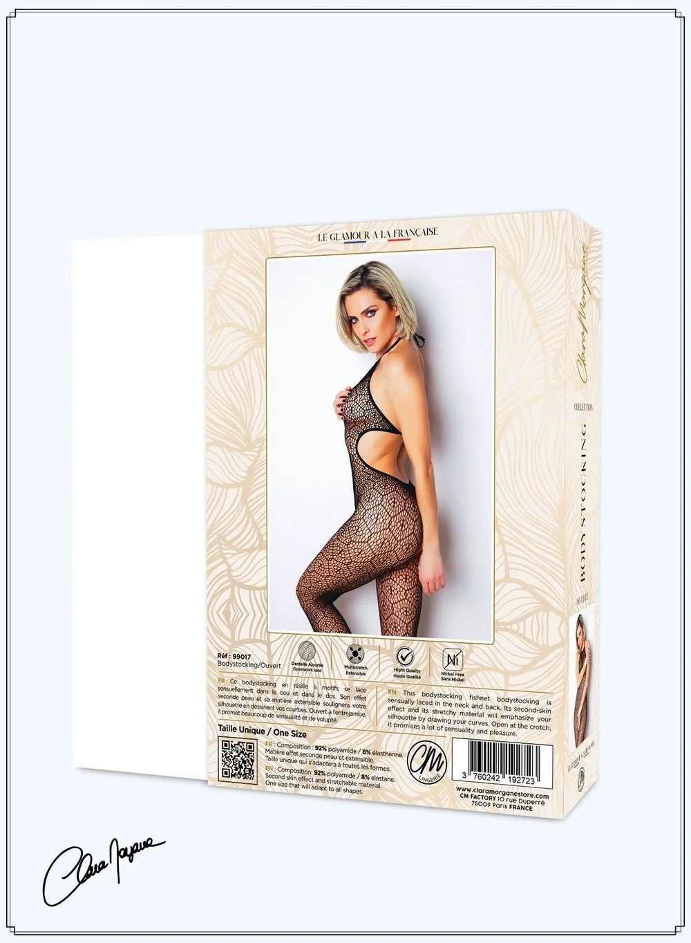 Sexy Bodystocking, Clara Morgane, mit feinen Netzmustern. Am Hals und Rücken gebunden, wird es jede Ihrer Kurven umschmeicheln und Ihre Silhouette betonen. Der Stoff mit Zweite-Haut-Effekt passt sich Ihrer Silhouette an. Zusammensetzung: 92% Polyamid und 8% Elasthan