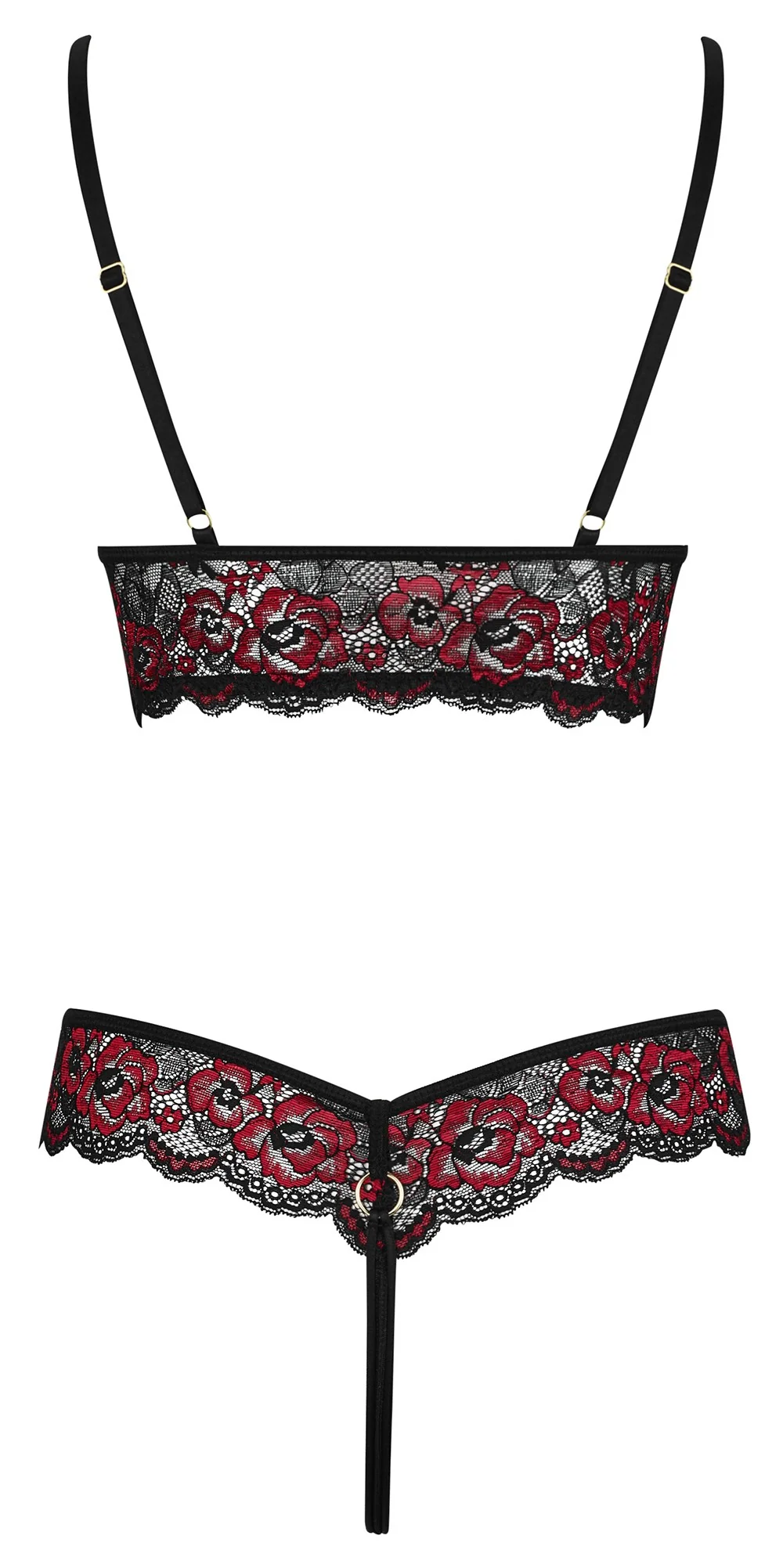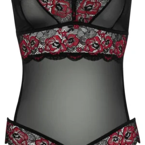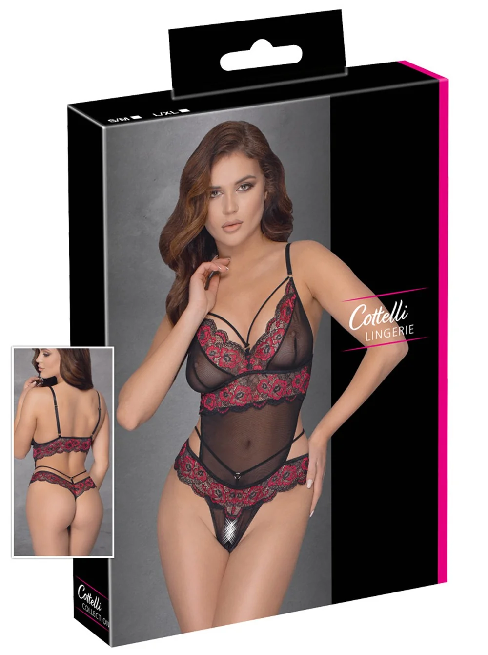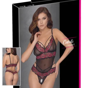 Sublimer Body-String aus roter und schwarzer floraler Spitze und feinem transparentem Netz an den Körbchen und am Bauch. Dehnbare Bänder mit dekorativen Ringen am Ausschnitt und an der Taille. Im Schritt offen. Zweiteiliger Look auf der Rückseite. Verstellbare Träger für eine perfekte Passform. Body-String aus zweifarbiger floraler Spitze und Netz aus der Cottelli-Kollektion. 90% Polyamid, 10% Elasthan.