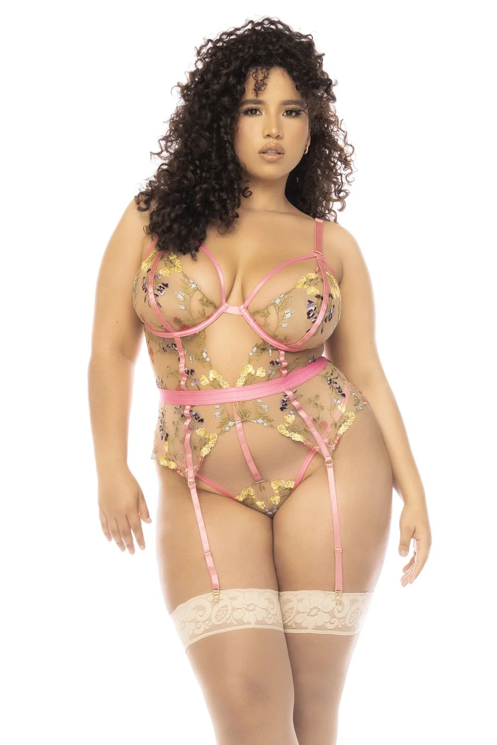 Body mit großer Größe und floraler Stickereispitze Sydney, verstellbare und abnehmbare Strumpfhalter – MAL8821XPKGD