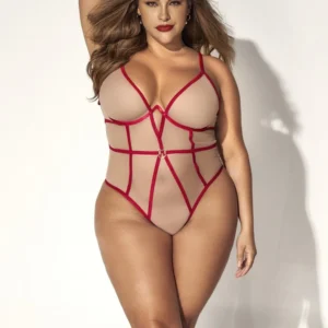 So Sexy! Dieser raffinierte und elegante Body in großen Größen. Hautfarbener Netzstoff, akzentuiert durch rote Nähte. Body mit Bügeln für besseren Halt und kleinem Metallherz auf der Vorderseite. Verstellbare Träger. String-Body…brasilianische Abdeckung. Verstellbarer Verschluss im Schritt. Zusammensetzung: 70% Polyamid 30% Elasthan
