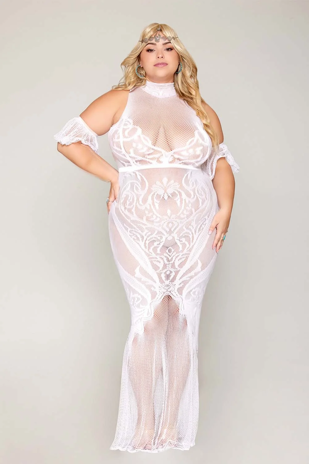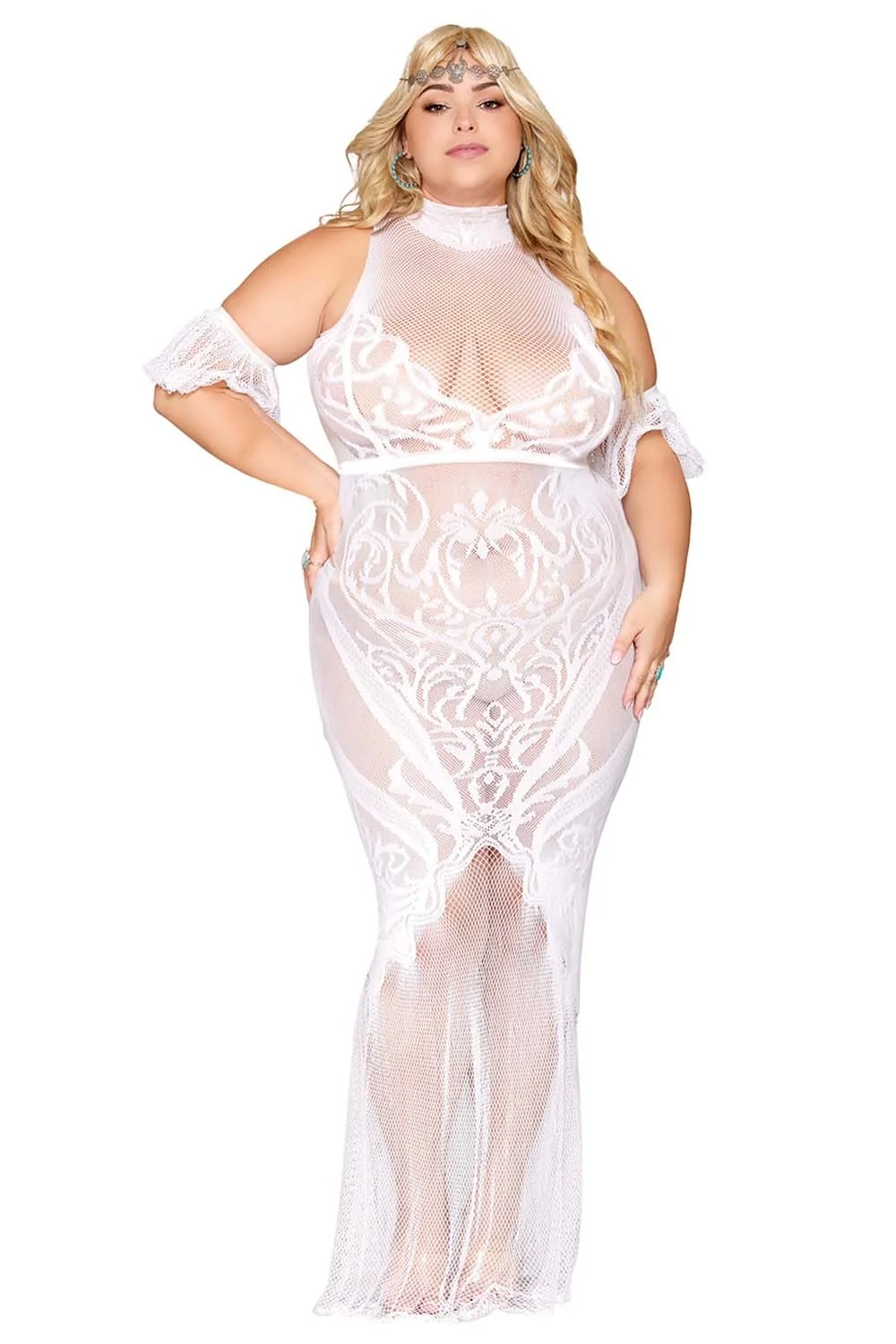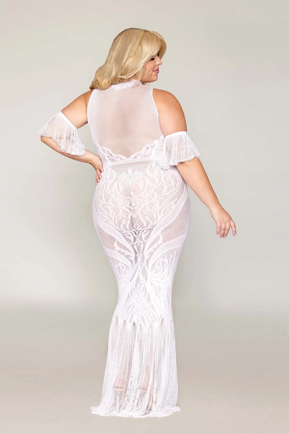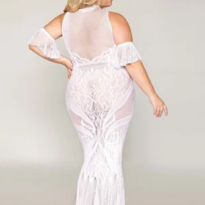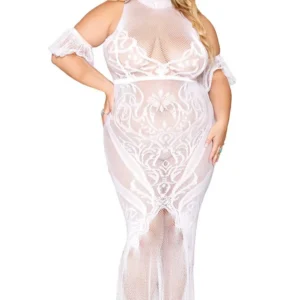 Bodystocking-Kleid, große Größe, aus Netz und weißer Spitze – DG0490XWHT