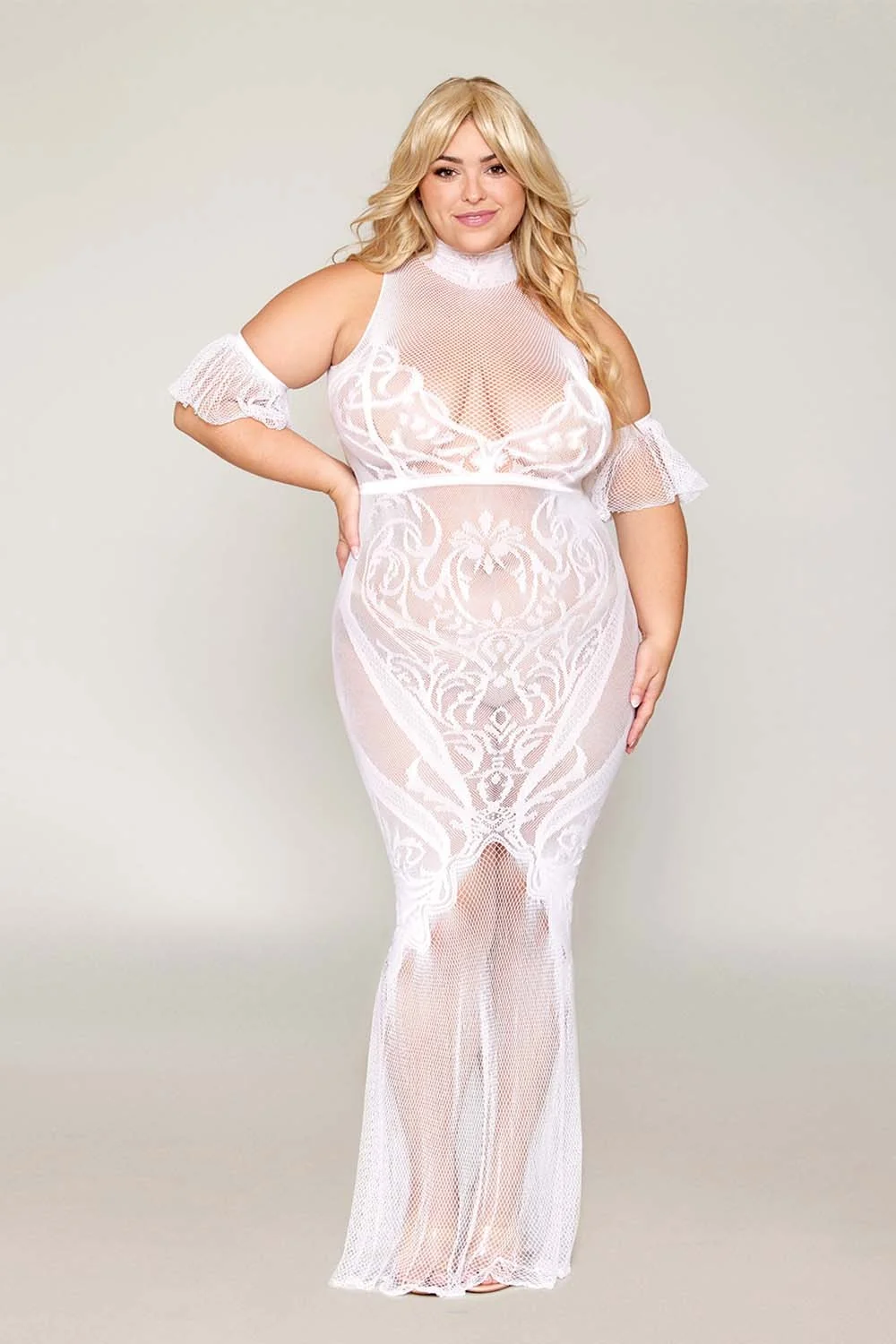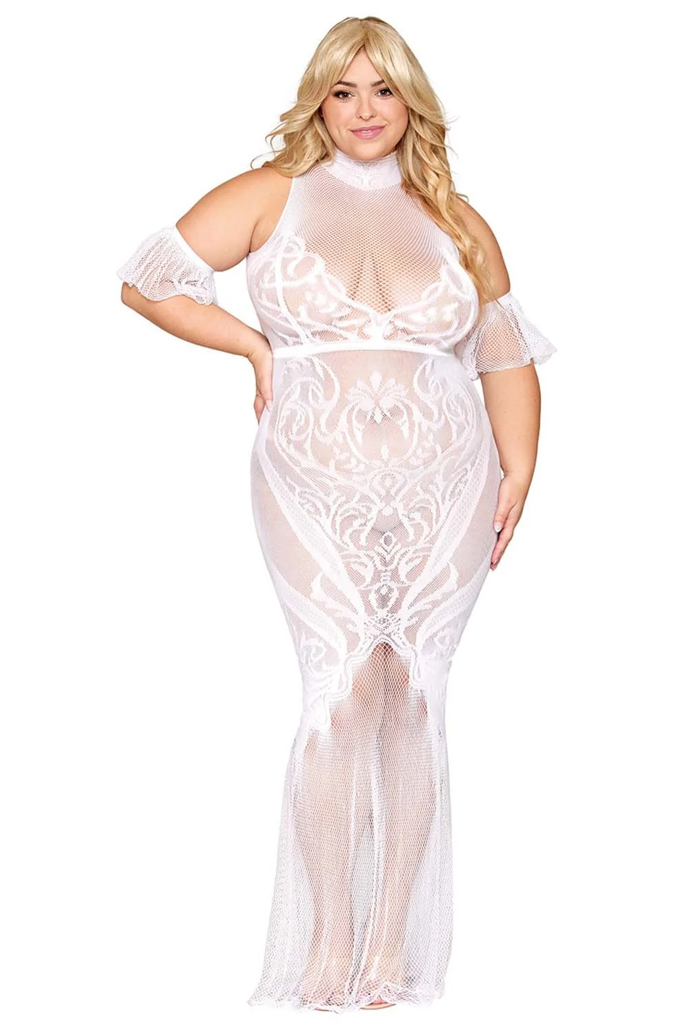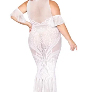 Weißes Bodystocking-Kleid, große Größe, nahtlos mit personalisiertem Spitzenmuster und Netzeinsätzen. Breiter Kragen und separate, schwebende Netzärmel inklusive. String nicht enthalten. Zusammensetzung: Bodystocking-Kleid: 93 % Nylon, 7 % Elasthan. Pflegehinweis: Separat von Hand in kaltem Wasser waschen, nicht im Trockner trocknen.