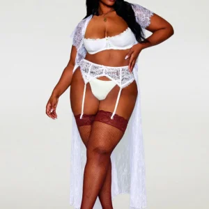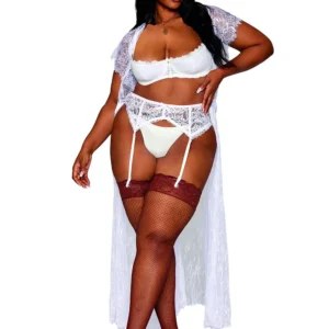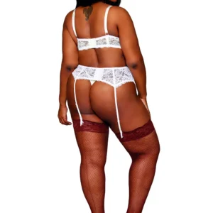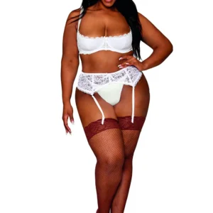 Halbschalen-BH in großen Größen, aus feiner, dehnbarer weißer Spitze. Bügel-BH mit offenen Körbchen. Verstellbare Träger, Hakenverschluss im Rücken. Gezeigt mit Strumpfhalter, Ref. 8735 und Strümpfen, Ref. 0492; separat erhältlich. String nicht enthalten. Zusammensetzung: Shelf Bra: Spitze: 85% Nylon, 15% Spandex; Schaumstoff-Cup: 100% Polyurethan; exklusive Dekoration. Pflegehinweis: Handwäsche in kaltem Wasser, kein Bleichmittel, nicht im Trockner trocknen.