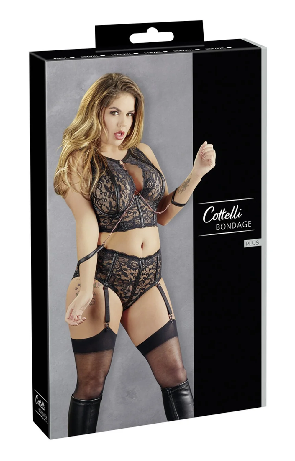 Bügel-BH und Strapsgürtel mit abnehmbaren Handschellen, große Größe, mit diesen abnehmbaren Handschellen. Eine zarte Spitze für Momente voller fesselnder Vergnügen! Sein schwarzer BH und Strapsgürtel aus weicher und dehnbarer Spitze. Die abnehmbaren Handschellen sind perfekt für Momente voller fesselnder Vergnügen. Die Handschellen sind mit Ketten und einem Karabinerhaken ausgestattet und am Ausschnitt des schwarzen Spitzen-BHs befestigt. Der Bügel-BH hat einen Hakenverschluss am Rücken und einen kleinen Clipverschluss im Nacken. Die Strapse an der Hose können entfernt werden. Zusammensetzung: 90% Polyamid, 10% Spandex.