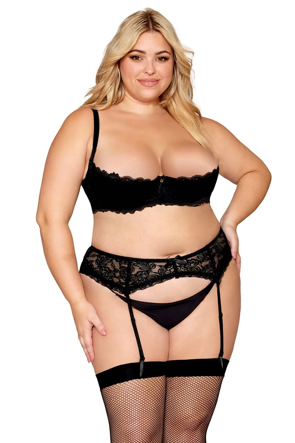 Sinnlichkeit und Sanftheit… Halbschalen-BH, große Größe, aus feiner, dehnbarer schwarzer Spitze. Bügel-BH mit offenen Körbchen. Verstellbare Träger, Hakenverschluss im Rücken. Gezeigt mit Strumpfhalter, Ref. 8735 und Strümpfen, Ref. 0492; separat erhältlich. String nicht inbegriffen. Zusammensetzung: BH: Spitze: 85% Nylon, 15% Spandex; Schaumstoffschale: 100% Polyurethan; Ausschließlich Dekoration / Pflegehinweis: Separat von Hand in kaltem Wasser waschen, nicht im Trockner trocknen.