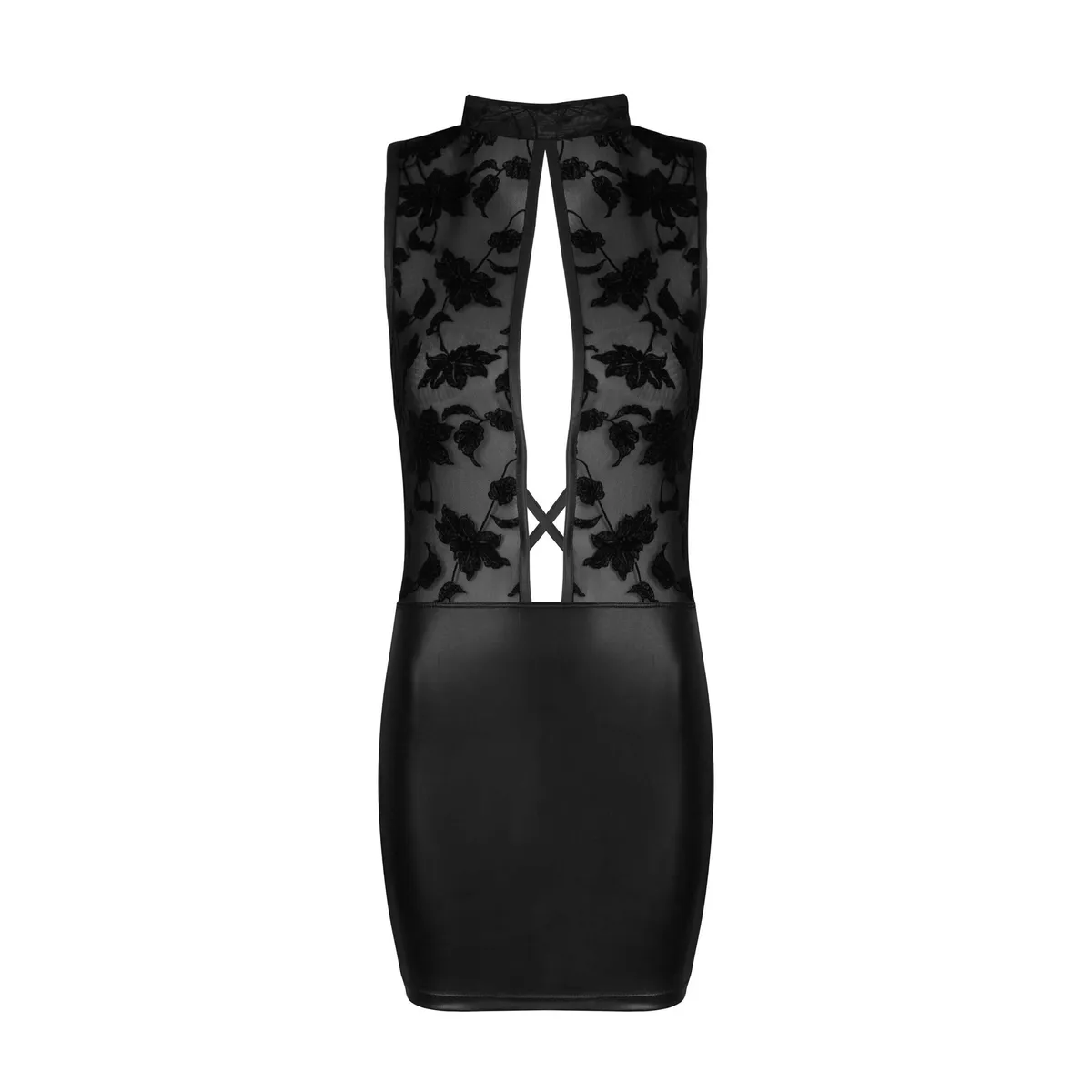 Ein sexy und elegantes Kleid für mutige Frauen, die den klassischen Stil schätzen. Der obere Teil besteht aus schönem Tüll mit einem samtigen Blumenmuster. Der tiefe Ausschnitt vorne und hinten verleiht Charme. Der untere Teil ist ein Minirock aus Kunstleder. Das Kleid hat einen Klettverschluss am Hals. Das Kleid ist perfekt nicht nur für Abende mit der anderen Hälfte, sondern auch für Partys. Das Set enthält passende Slips. Das Set wird in einer eleganten Verpackung mit einem Foto des Produkts geliefert. Größen: S/M und L/XL Größe S/M: (Brust: 81-91 cm, B-C, Taille: 56-71 cm, Hüfte: 85-97 cm) Größe L/XL: (Brust: 91-107 cm, C-D, Taille: 71-91 cm, Hüfte: 97-112 cm) Material: 88% Polyester, 12% Elasthan