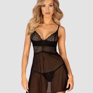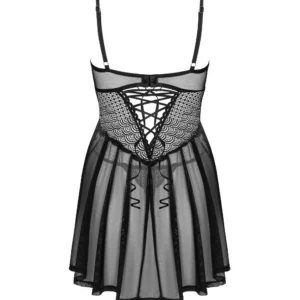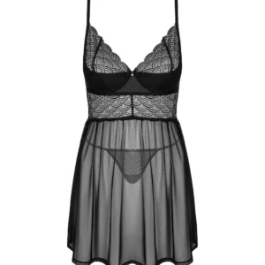 Nuisette et string Chemeris Nuisette et string noirs transparentsVous prévoyez un rendez-vous spécial ? Vous voulez créer une atmosphère romantique tout en ajoutant du piquant à votre chambre ? La nuisette de la collection Chemeris est un superbe choix ! Un tissu aéré et transparent combiné à des motifs subtils est une combinaison accrocheuse. De plus, le laçage réglable dans le dos accentue de manière tentante la taille et assure le confort. N’hésitez plus et offrez-vous le luxe ! Regardez les détails : ? Nuisette et string Chemeris noirs ? laçage réglable au dos, bretelles et fermeture à plusieurs niveaux ? garantie d’un ajustement parfait ? bonnets rembourrés et à armatures ? accentuation parfaite de la poitrine ? des décorations en dentelle uniques – attirent l’attention ? tissu transparent à haute élasticité ? assure votre confort (babydoll : 94% polyamide, 6% élasthanne ; string : 90% polyamide, 10% élasthanne)