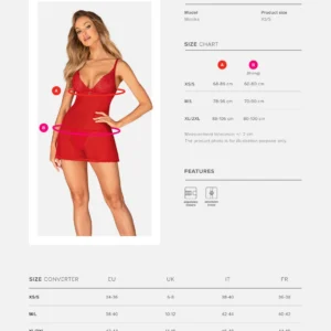 Chilisa babydoll & stringComment répandre une aura séduisante autour de vous et des vibrations chaudes dès que vous franchissez le seuil de la chambre? C?est une évidence ? ce babydoll rouge est le choix parfait pour vous! Laissez-vous tenter par cette lingerie séduisante et minimaliste. Soyez sexy sans renoncer au confort.Pour en savoir plus :- nuisette et string rouge- ajustement parfait grâce aux sangles réglables et à la fixation en plusieurs étapes- dentelle séduisante ? finitions sensuelles- pendentif en argent en forme de c?ur ? un détail intéressant avec des zircons- une élasticité élevée du tissu assure le plus haut niveau de confort (babydoll 94% polyamide, 6% élasthanne; string 90% polyamide, 10% élasthanne)