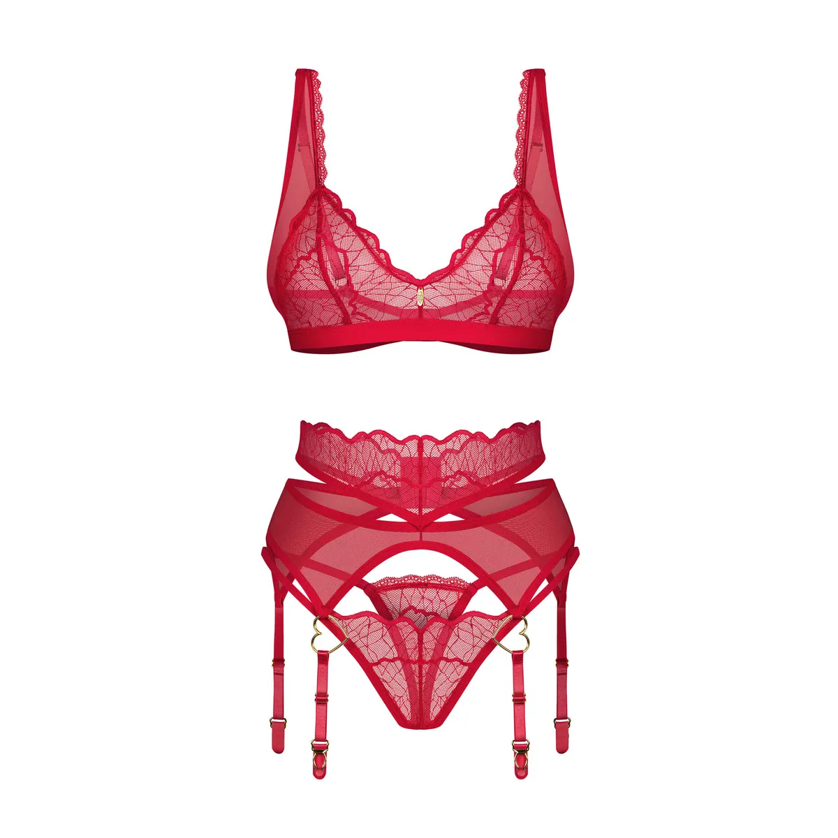 Cupide Desir Set 3-teilig Dieses dreiteilige Set in leuchtendem Rot umfasst ein Bustier, einen String und einen Strumpfhalter, hergestellt aus bequemen und elastischen Stoffen für eine perfekte Passform. Mit einem verführerischen Schnitt und einzigartigen Details ist dieses Set darauf ausgelegt, ein fesselnder Blickfang zu sein. – Enthält einen Strumpfhalter, einen String und ein Bustier – Weiche und dehnbare Stoffe für mehr Komfort – Spitze mit modernem Muster – Verstellbare Träger und Stützband – Hakenverschluss hinten – Goldene Akzente für einen bemerkenswerten Look – Nickelfreie Komponenten – Stoff: 90% Polyamid, 10% Elasthan; 94% Polyamid, 6% Elasthan – Entworfen in der EU