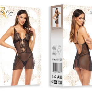 Une chemise de nuit noire et délicate pour les femmes qui apprécient l?élégance classique même dans la chambre. La chemise de nuit, faite de tulle et de belle dentelle, dispose d?une fente qui expose gracieusement la hanche sur le côté gauche.Un ornement brillant est placé entre les tasses, ajoutant une touche de sophistication à la chemise de nuit. Le dos de la chemise de nuit met magnifiquement en valeur le dos, et la fermeture réglable à l?arrière permet un ajustement parfait à la silhouette. L?ensemble comprend une culotte avec le même motif de dentelle que sur la chemise de nuit.L?ensemble est présenté dans un emballage élégant avec une photo mettant en valeur le produit. Taille : S/M et L/XLTaille S/M : (Seins : 81-91 cm, B-C, Taille : 56-71 cm, Hanche : 85-97 cm)Taille L/XL : (Seins : 91-107 cm, C-D, Taille : 71-91 cm, Hanche : 97-112 cm)Matière : 88% polyester, 12% élasthanne