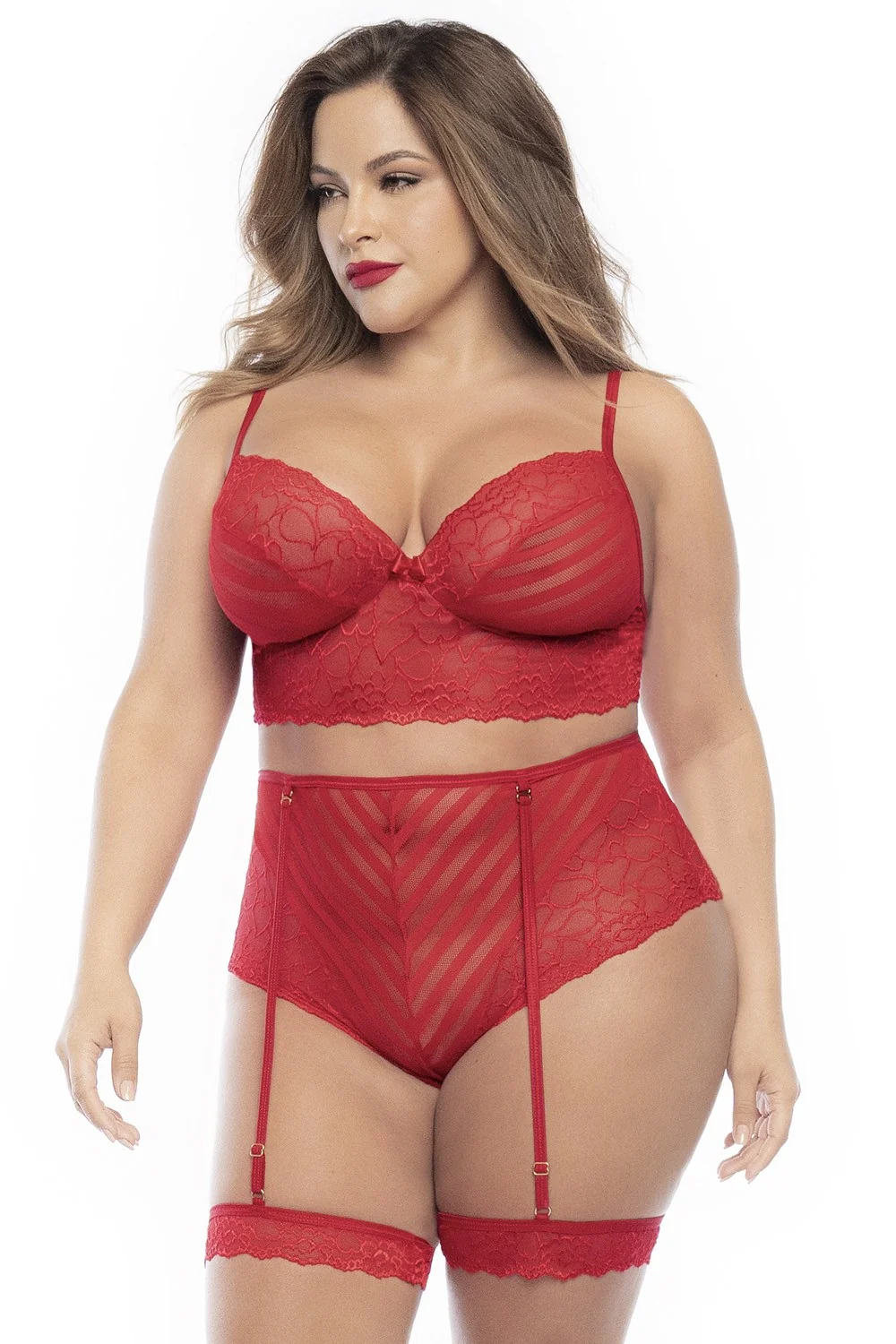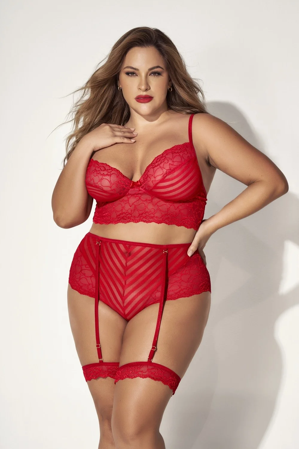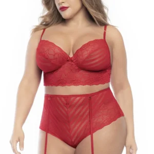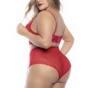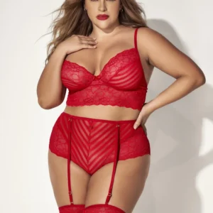 Gönnen Sie sich eine sinnliche Romanze, ohne auf Ihren Komfort zu verzichten, mit diesem zweiteiligen Dessous-Set in großen Größen, bestehend aus einem roten Spitzen-BH mit Streifen. Eine passende hochgeschnittene Unterhose und abnehmbare Strumpfhalter. Zusammensetzung: 88% Nylon 12% Elasthan/81% Polyamid 19% Elasthan