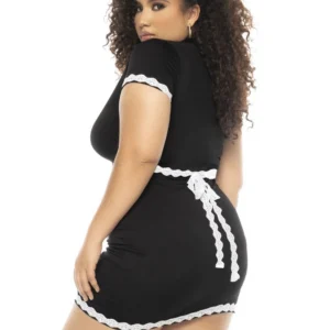 Sexy Dienstmädchenkostüm in Übergröße, das garantiert alle Blicke auf sich zieht. Das Set umfasst ein Kleid mit dekorativen Knöpfen, eine Schürze und eine Haube. Genießen Sie die verspielte und verführerische Atmosphäre dieses Outfits, perfekt, um jeder Kostümparty einen Hauch von Charme zu verleihen. Zusammensetzung: 93% Polyester 7% Elasthan – Pflegehinweis: Handwäsche, kein Bleichmittel verwenden, nicht bügeln.