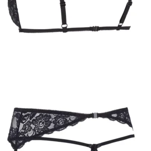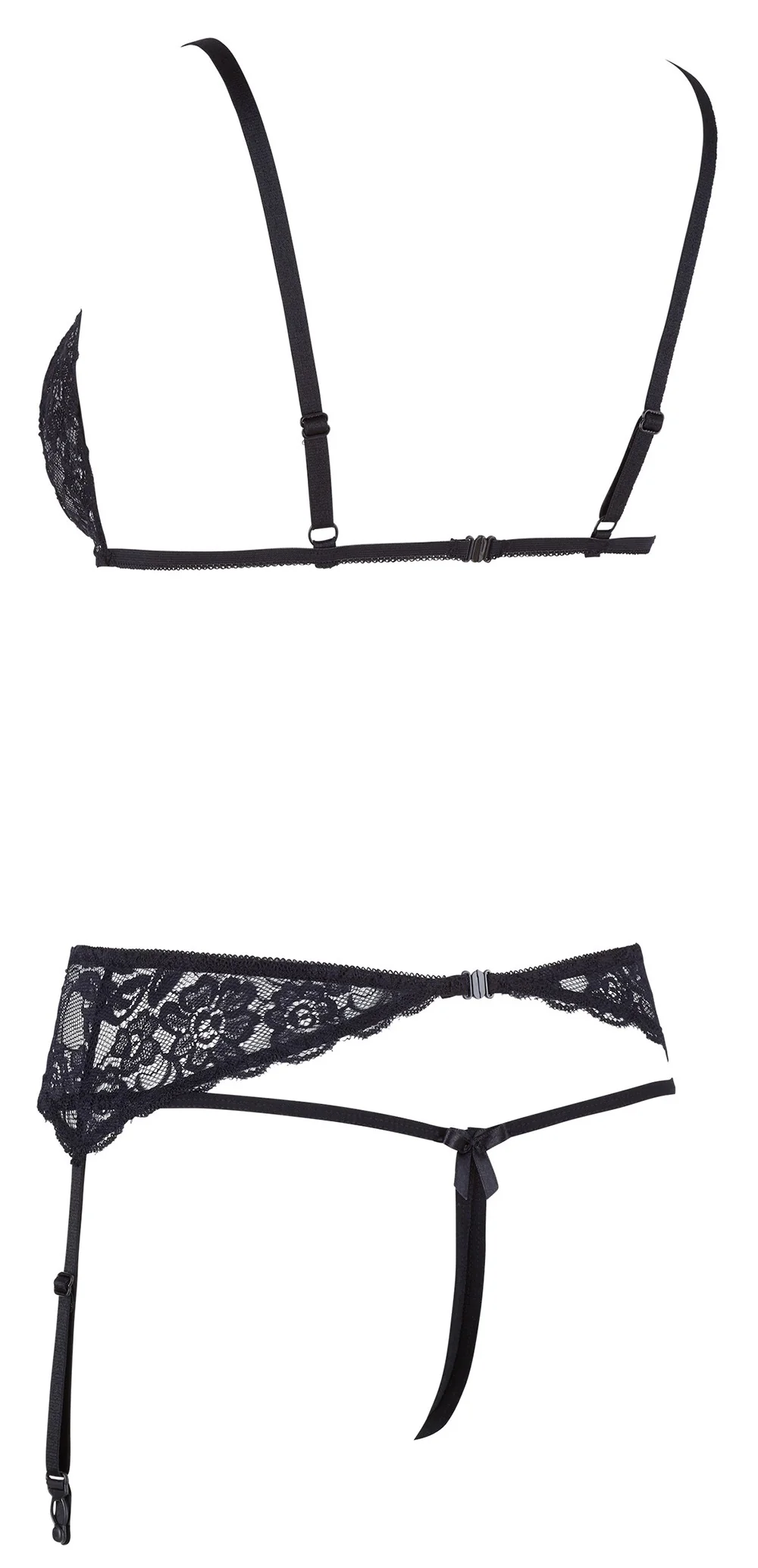 Dreiteiliges Set aus zarter schwarzer Blumenspitze. Der BH mit geteilten Cups und diesen kleinen dekorativen Riemen auf Brusthöhe. Betont durch einen dekorativen Ring. Verstellbare Träger. Der Strumpfhalter aus schwarzer Spitze mit verstellbaren Strumpfhaltern. Nicht zu vergessen der schwarze String mit offenem Schritt. Dreiteiliges Set mit geteiltem BH, Strumpfhalter und schwarzem String aus der Cottelli-Kollektion. Zusammensetzung: 90 % Polyamid, 10 % Elasthan.