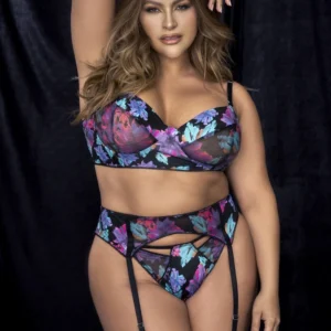 Ein exotisches Blumenmotiv, das Sinnlichkeit und Geheimnis heraufbeschwört. Dreiteiliges Set für kurvige und üppige Frauen. Bestehend aus einem floralen Bügel-BH mit verstellbaren und abnehmbaren Trägern. Ein Strumpfhalter und der dazu passende String aus der Mapalé Lingerie Kollektion. Zusammensetzung: 78% Polyester 22% Elasthan/86% Polyester 14% Elasthan