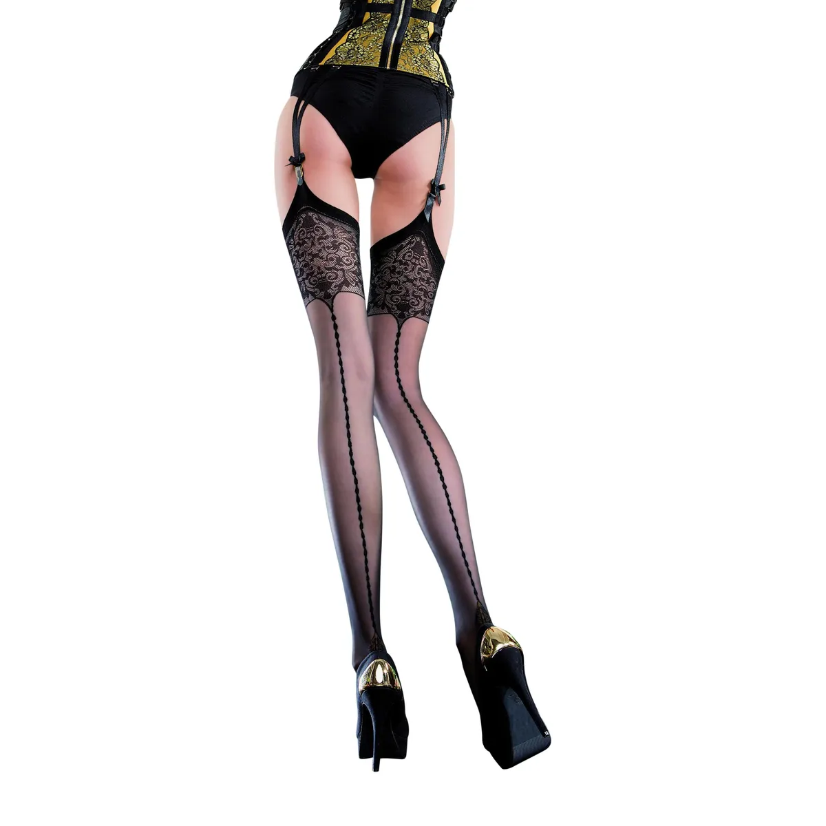 Sinnlich gemusterte Strümpfe, verstärkt im Zehenbereich. Zusammensetzung: 86% Polyamid, 14% Elasthan