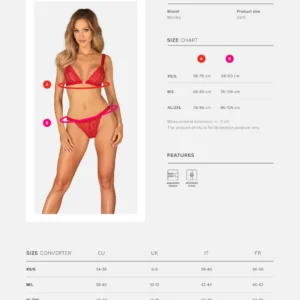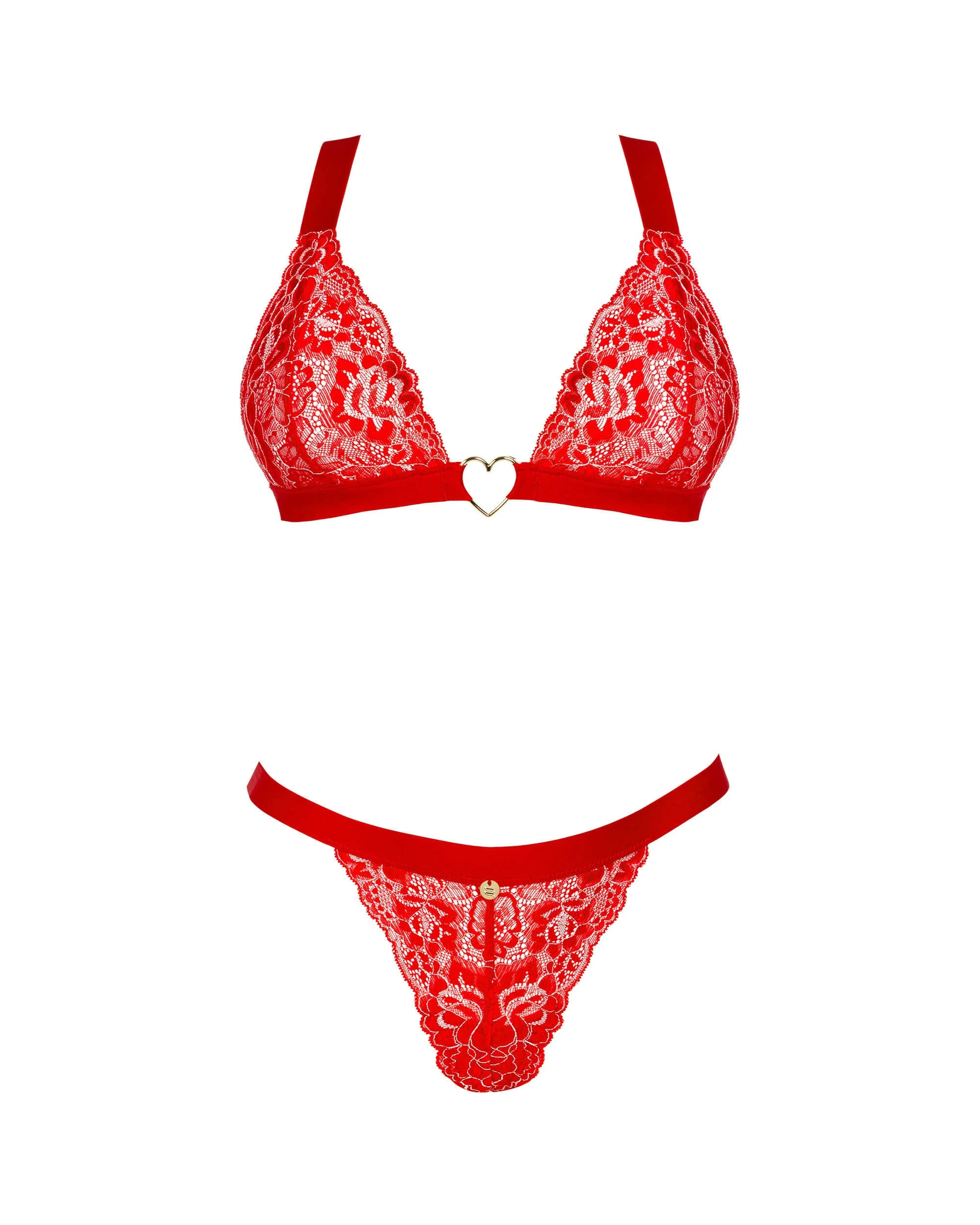 Ensemble 2 pièces ElianesVous recherchez quelque chose de délicat et de puissamment féminin ? Laissez-vous charmer par cette lingerie rouge ! Ajoutez du sex-appeal et devenez une source subtile de chaleur irrésistible dans votre chambre! Regardez les finitions élégantes en dentelle qui mettront merveilleusement en valeur votre beauté. Profitez des moments ensemble et laissez-vous emporter par le plaisir.Pour en savoir plus :- un ensemble rouge ? string et soutien-gorge- excellent ajustement grâce aux sangles réglables et à la fixation en plusieurs étapes- bordure en dentelle séduisante- connecteur métallique en forme de c?ur doré ? un détail intrigant- pendentif brillant ? un ajout subtil- doux au toucher ? procure une sensation de confort (90 % polyamide, 10 % élasthanne)
