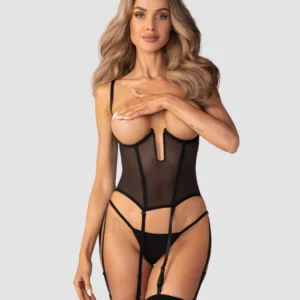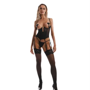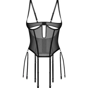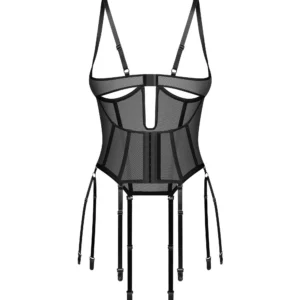 Corset ouvert EuphoriUn corset noir avec un design ouvert et sans couette doté d?un dessous de buste qui soulève et accentue la poitrine. Fabriqué à partir de tissu semi-transparent et doux au toucher. Les baleines verticales façonnent optiquement la taille. Les jarretelles amovibles et réglables, la fermeture à plusieurs niveaux dans le dos et les bretelles ajustables assurent un ajustement sur mesure.- cupless design ? pas de bonnets pour soutien-gorge- buste et taille désossée- huit lanières en jarretelles amovibles et réglables- bretelles réglables- fermeture à crochets et yeux multi-étapes à l?arrière- les éléments de connexion sont sans nickel- 94% polyamide, 6% élasthanne- conçu dans l?UECe produit ne convient pas aux enfants de moins de 3 ans ? risque d?étouffement en raison des petites pièces qui peuvent être détachées du produit.
