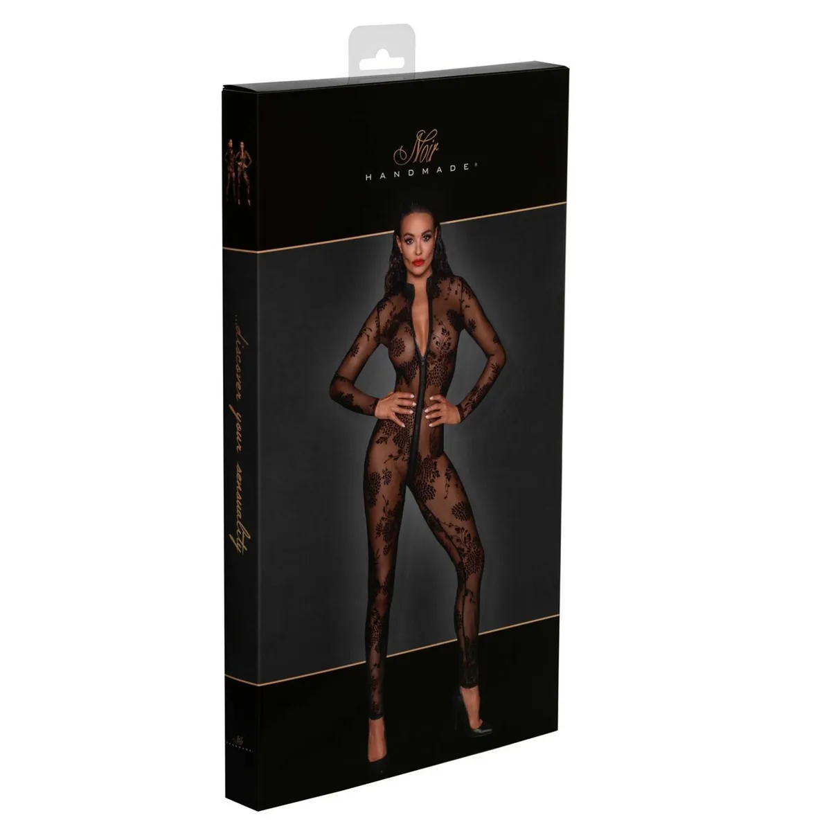 ProduktbeschreibungElastisches PowernetTransparentReißverschlussDieser lange, sexy Tüllanzug ist mit Flockstickereien verziert und verfügt über einen langen Drei-Wege-Reißverschluss, der vom Kragen bis zum Schritt reicht. Dieser transparente Look betont die kokette Weiblichkeit.
