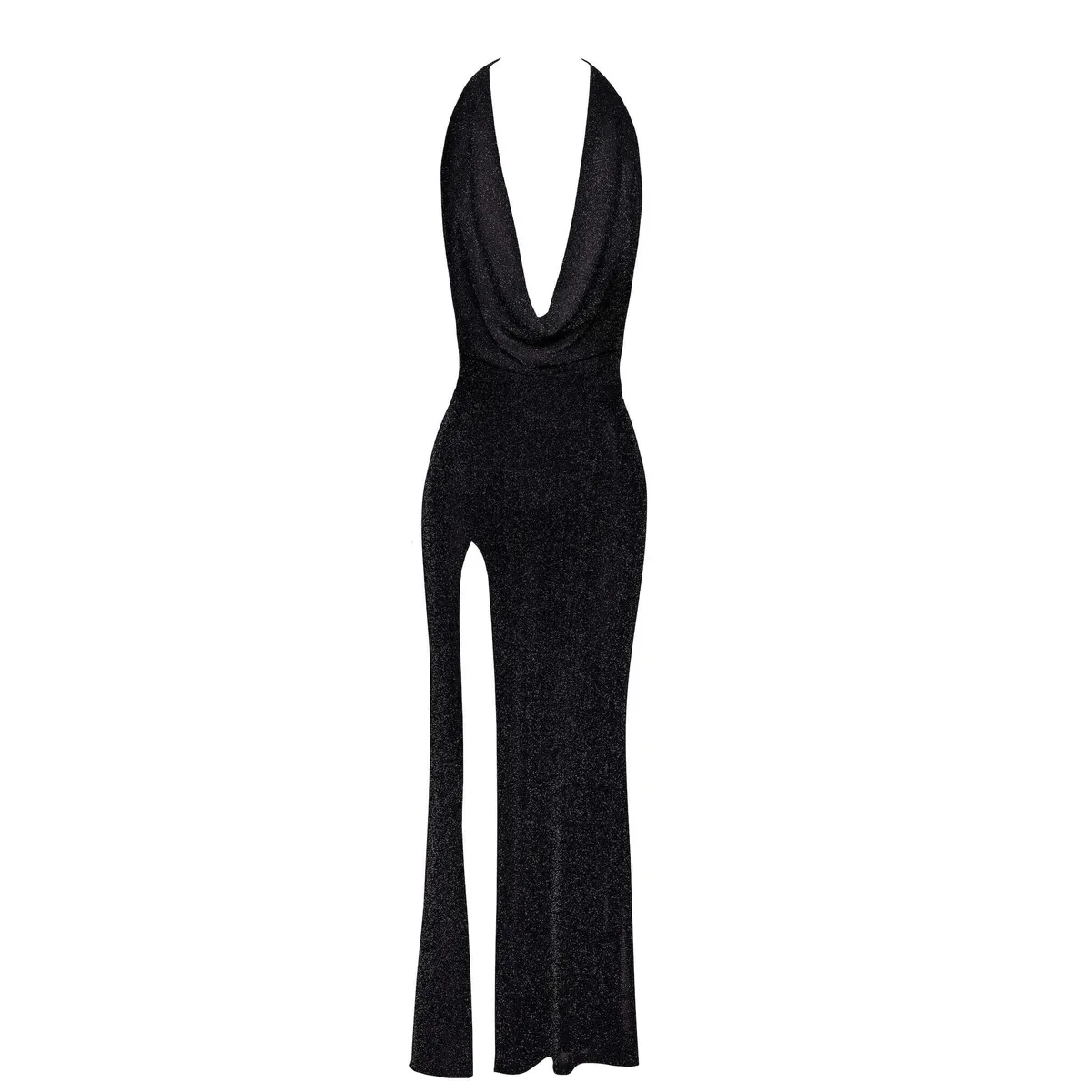 Ein langes Kleid aus fließendem Tüll mit Silberfäden. Es hat einen offenen Rücken, der mit einem Strassriemen verziert ist, und einen drapierten Kragen, der um den Hals gebunden wird. Ein tiefer Schlitz vorne. 75% Polyamid 20% Polyester 5% Elasthan