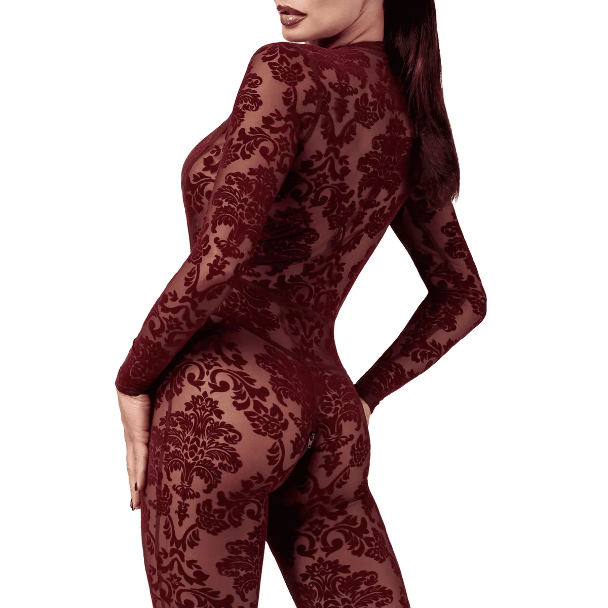 Bordeauxfarbener Tüllanzug mit Flockdruck. Ausgestattet mit einem tiefen V-Ausschnitt, langen Ärmeln und langen Beinen. Mit einem Reißverschluss im Schrittbereich für mehr Komfort entworfen. Material: 86% Polyester, 14% Elasthan