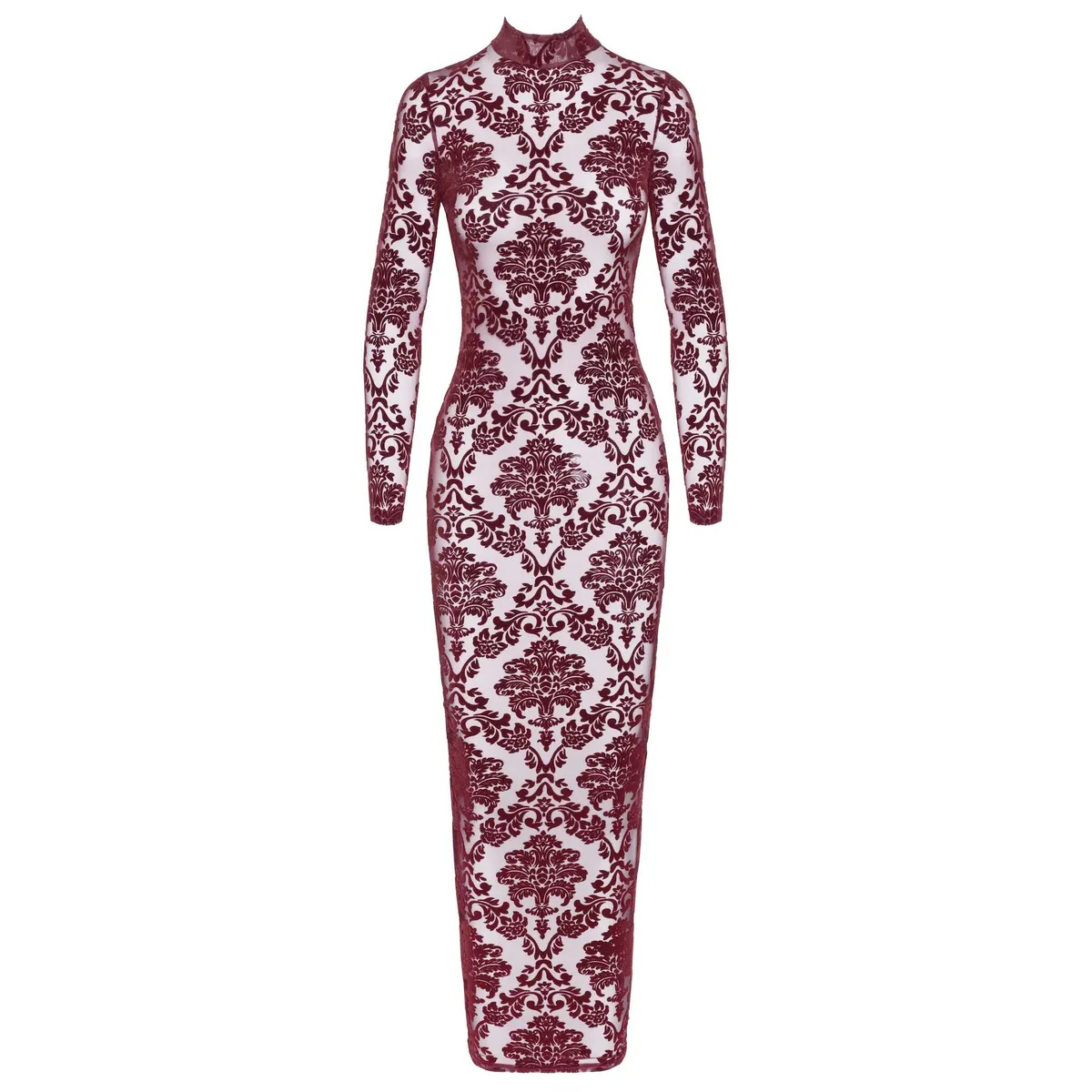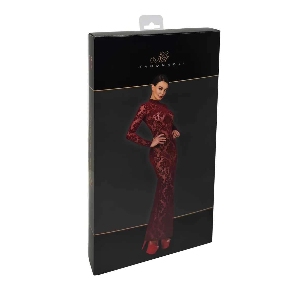 Langes Kleid aus neuem schwarzem Stoff? Bordeauxfarbener Flocktüll. Mit langen Ärmeln, einem eleganten Muster und offenem Rücken. Hoher Kragen mit Haken- und Ösenverschlüssen. Der hintere Schlitz verleiht eine verführerische Note. Material: 86% Polyester, 14% Elasthan