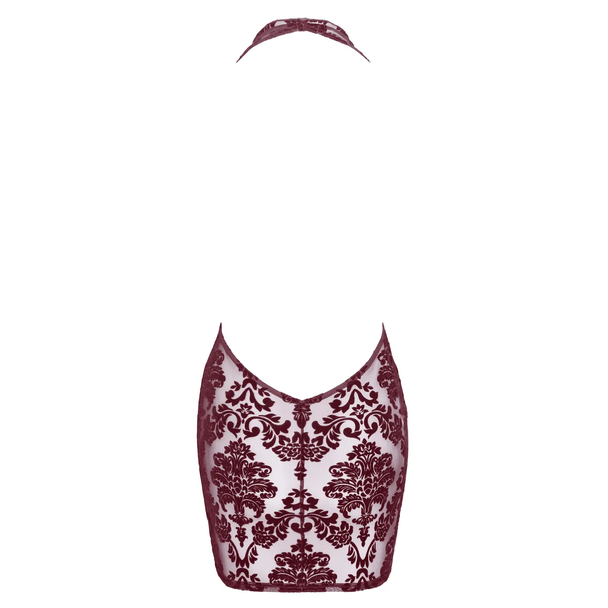 Mini-Kleid aus bordeauxfarbenem Flocktüll. Mit offenem Rücken und Wasserfallausschnitt. Material: 86% Polyester, 14% Elasthan