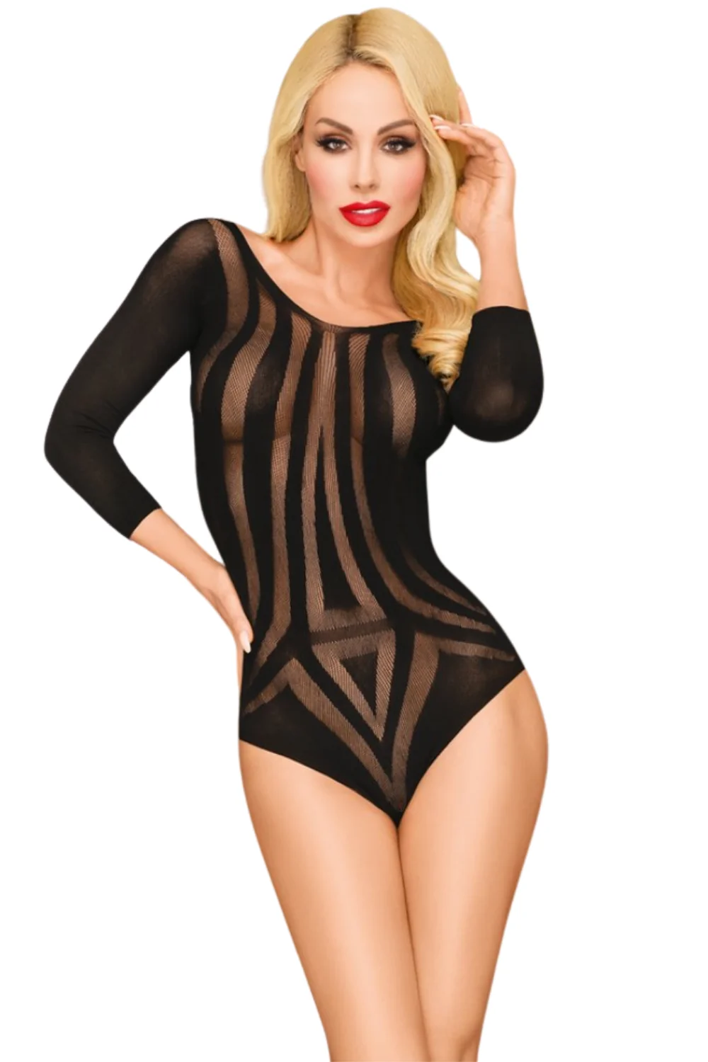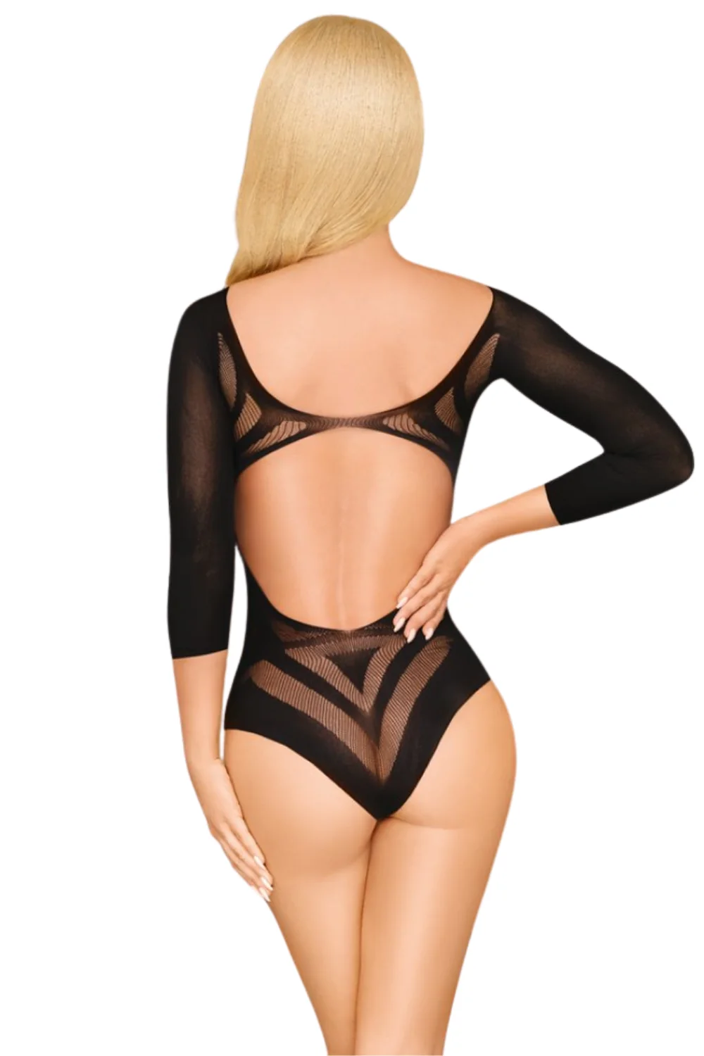 Schwarzer Body aus feinem Netz, der mit einem Wechsel von undurchsichtigen und transparenten Streifen spielt. Rückenfrei mit Öffnung im Schritt. Schwarzer Netzbody mit rückenfreiem Design und Öffnung im Schritt aus der Penthouse-Kollektion. Zusammensetzung: 92 % Nylon – 8 % Elasthan