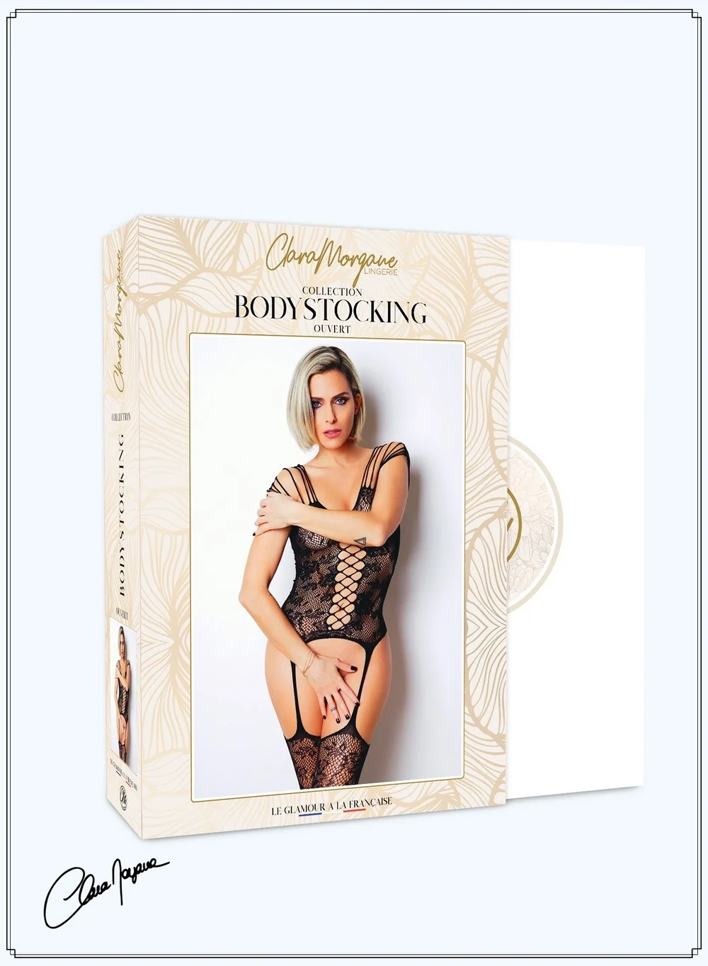 Wunderschöner Bodystocking aus floraler Spitze, Clara Morgane, mit diesen Trägern, die leicht kaskadenartig über die Schultern fallen. Die Öffnung am Bauch mit gekreuzter Schnürung und die florale Spitze auf der Brust betonen Ihre Kurven. Die Strumpfhalter aus derselben floralen Spitze laden zum Berühren und zur Erotik ein. Der dehnbare und figurbetonte Stoff schmiegt sich perfekt an Ihren Körper an. Zusammensetzung: 92% Polyamid und 8% Elasthan