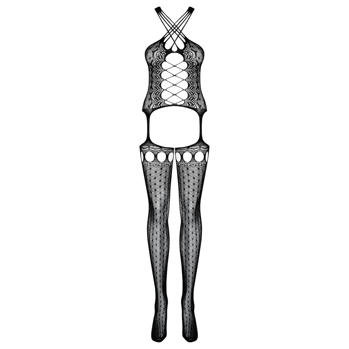 Ein einzigartiger Look für diesen schwarzen Bodystocking der sexy Dessous-Marke Obsessive. Mehrere Träger, die sich am Rücken und am Dekolleté kreuzen, Schnüreffekt vorne, hübsche geometrische Muster und offene Strümpfe – hier ist ein sexy Bodystocking, der vorne den Stil eines Strapshemds mit Strumpfhaltern und hinten ein sexy 3-teiliges Set hat. In großen Größen erhältlich und perfekt dehnbar, besteht dieser Obsessive Bodystocking aus 90% Nylon und 10% Elasthan.