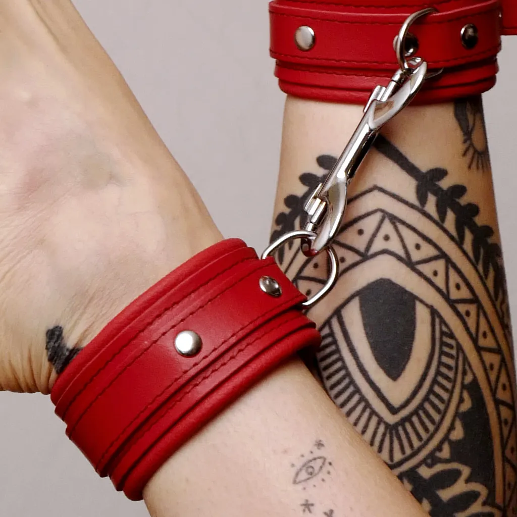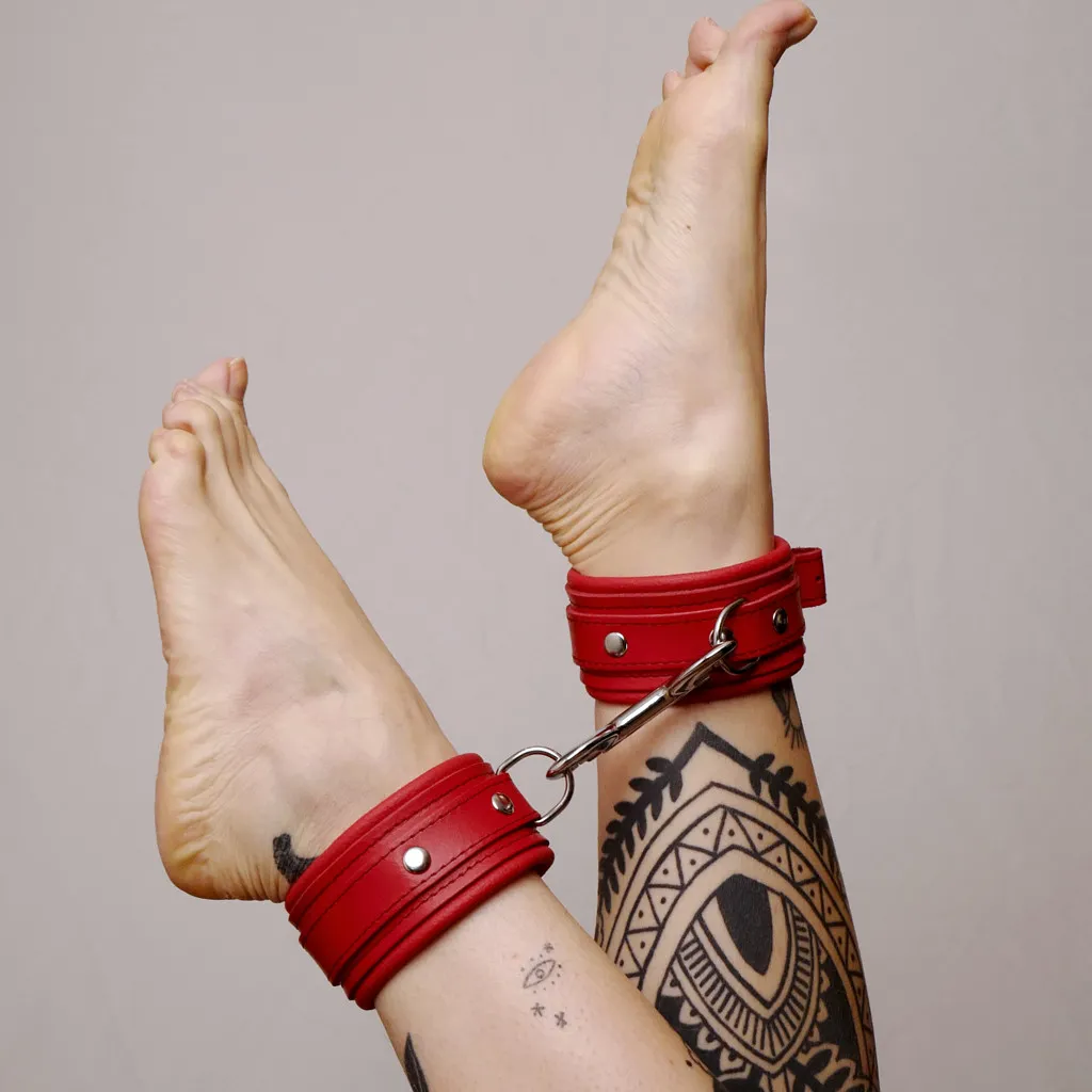 Ein Paar gepolsterte rote Lederfesseln mit Ringen zur Diversifizierung der Fesselspiele. Robustes und weiches Leder für BDSM-PraktikenDieses Paar rote Lederfesseln ermöglicht es, einzuschränken, ohne zu verletzen. Keine Angst vor Schnitten oder Schwitzen, dieses weiche Material ist so konzipiert, dass es unter allen Umständen bequem ist. Diese Lederfesseln mit Ringen sind dazu gemacht, die Knöchel effektiv, aber sanft zu fixieren. Sie sind perfekt, um die Knöchel bequem einzuschließen und BDSM-Praktiken sicher zu ermöglichen. Außerdem sind sie unisex und verstellbar, um zu allen Knöcheln zu passen.Ein anpassungsfähiges Fesselset nach WunschDiese roten Lederfesseln sind durch einen abnehmbaren Stahlkarabiner miteinander verbunden. Er kann leicht durch ein anderes Accessoire wie ein Hanf- oder Baumwollseil, ein Seidenband oder eine Leine ersetzt werden, um den Spielen der Unterwerfung freien Lauf zu lassen. Erstellen Sie Ihr komplettes Set, indem Sie es mit dem Halsband und den Handschellen derselben Kollektion kombinieren. Und das ist noch nicht alles! Die Möglichkeiten sind endlos, und um die Spiele der Unterwerfung zu variieren, stehen weitere Accessoires zur Verfügung, wie ein Oberschenkelgurt, Aufhängeringe, Kerzen mit niedriger Temperatur usw. Der Weg zum Vergnügen ist endlos!