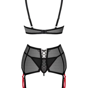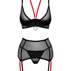 Imaginez la lumière des bougies, des regards profonds, des gestes tendres – une soirée parfaite ! La cerise sur le gâteau, c’est vous, vêtue d’une lingerie éblouissante et sexy. Il suffit de regarder ces éléments rouges qui attirent l’attention et qui créent une combinaison unique avec le tissu doux et transparent. Sentez-vous spéciale !Plus de détails :- ensemble de lingerie noire, comprenant un porte-jarretelles, un soutien-gorge et un string- ajustement parfait grâce aux bretelles réglables, à la fermeture en plusieurs étapes et au porte-jarretelles à laçage pratique- bretelles autour du cou et bonnets légèrement rembourrés avec armatures – ils mettent la poitrine en valeur de manière séduisante- des jarretelles que vous pouvez détacher quand vous le souhaitez- pendentif brillant – attire l’attention- tissu élastique, éléments en velours – confort garantiComposition : 94 % polyamide, 6 % élasthanne