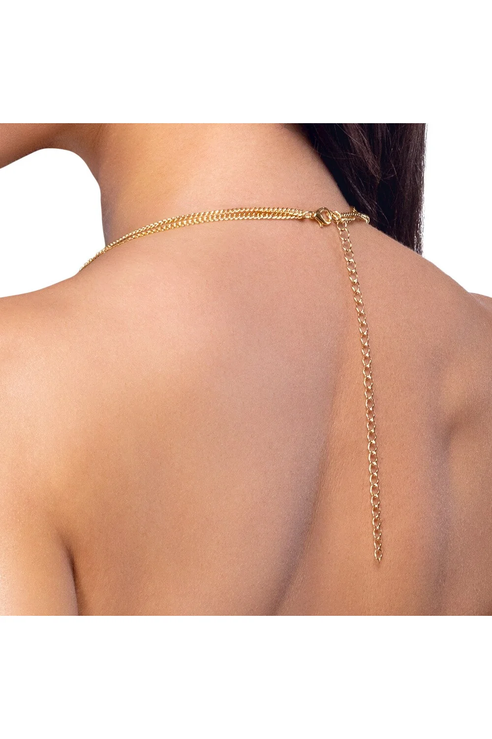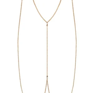 Entworfen, um die nackte Silhouette zu betonen oder ein figurbetontes Outfit oder einen Badeanzug zu schmücken, lässt sich diese Schmuckkette für den Körper leicht mit einem Karabinerverschluss und einer 15 cm langen Verlängerungskette anpassen, sodass sie für alle Körpertypen geeignet ist.