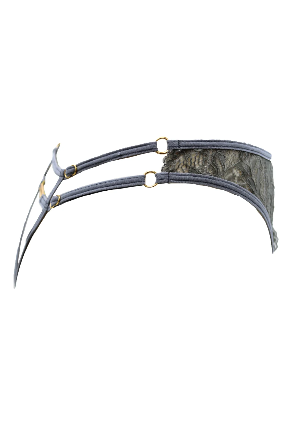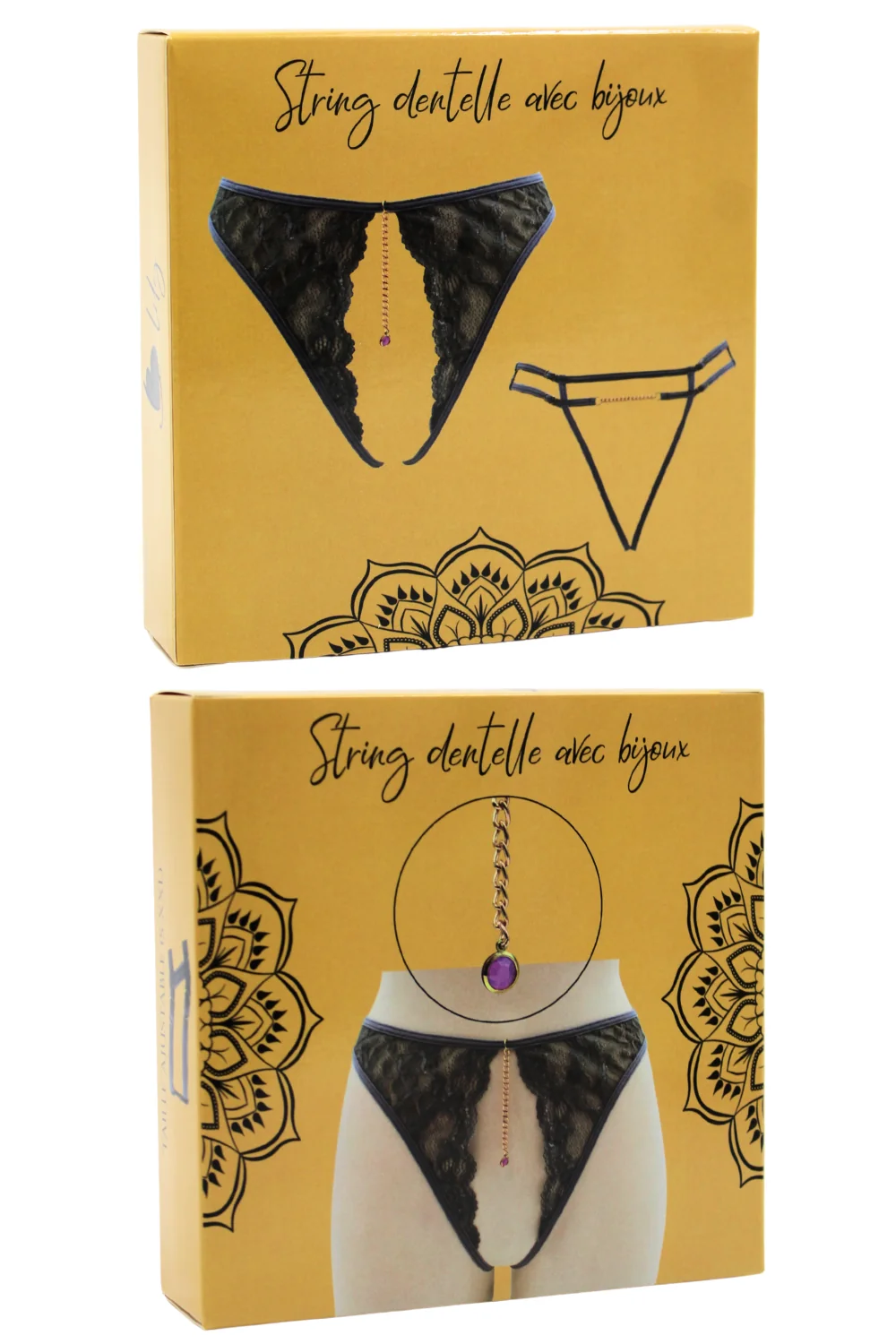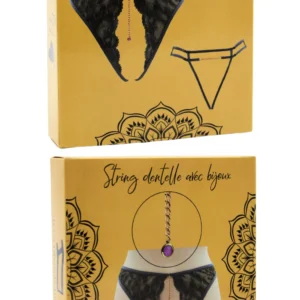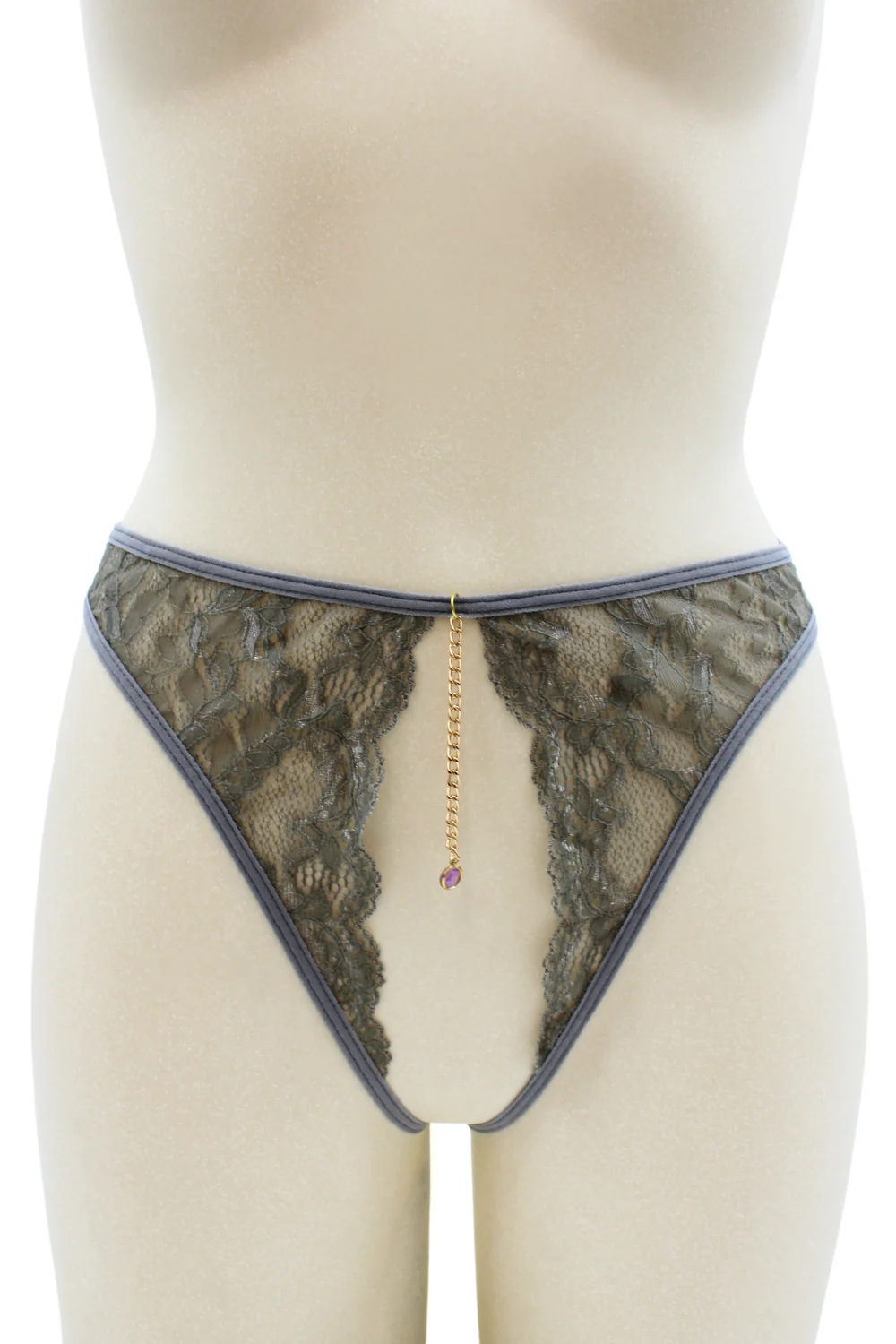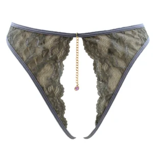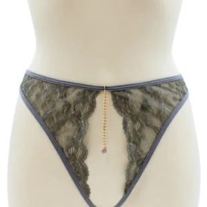 + Free ShippingIhr Dropshipping-Großhändler für sexy Dessous bietet Ihnen diesen String, offen im Schritt, mit goldenen Ketten und Schmuck in zufälliger Farbe, graue Spitze – String aus der Be lily Lingerie Kollektion.