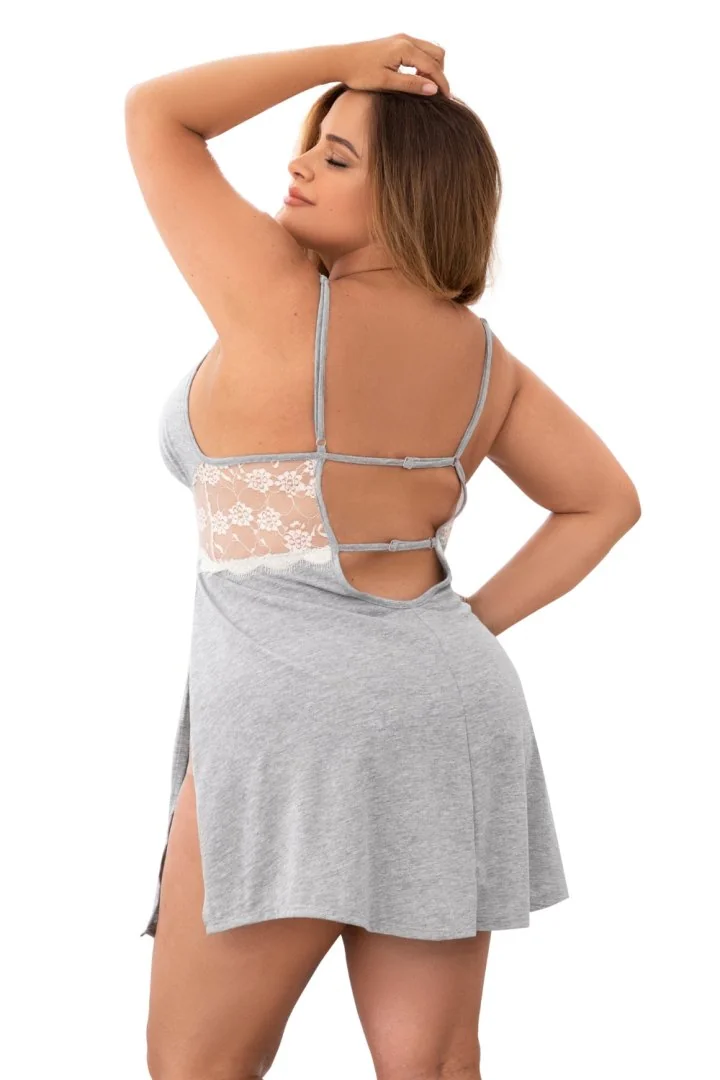 Graues Baumwoll-Nachthemd in großer Größe, seitlich geschlitzt und mit weißer Spitzenverzierung – MAL7313XGREY
